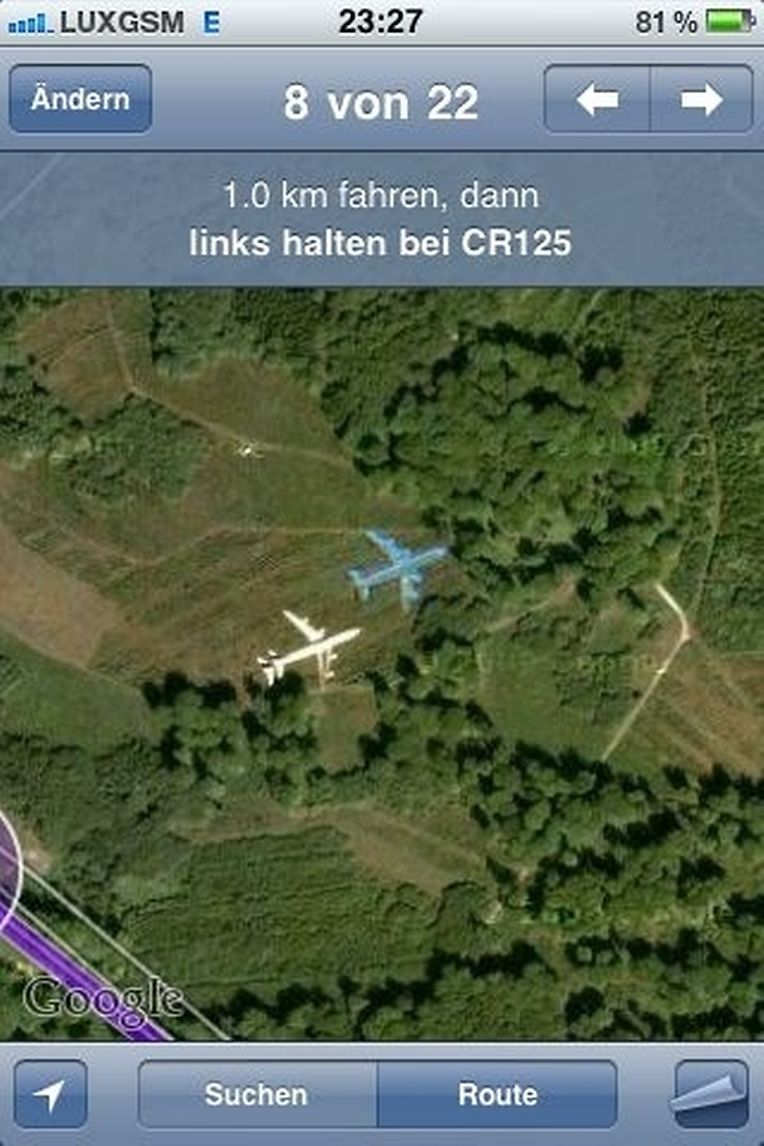 So kann man auf der Route, müsste Streckenpunkt 9 sein, im Anschluss der "Prince Henri" in Strasse in Helmsingen 2 Flugzeuge (ein weisses und ein blaues) erkennen, was auf einem Feld liegt ggf. fliegt.