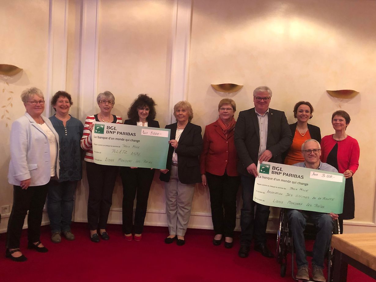 Récemment le Lions Club Mondorf-les-Bains a reçu 2 associations au Casino de Mondorf afin de leur remettre 2 chèques d'une valeur de 3000 Euros à l'asbl Blétz et AVR.