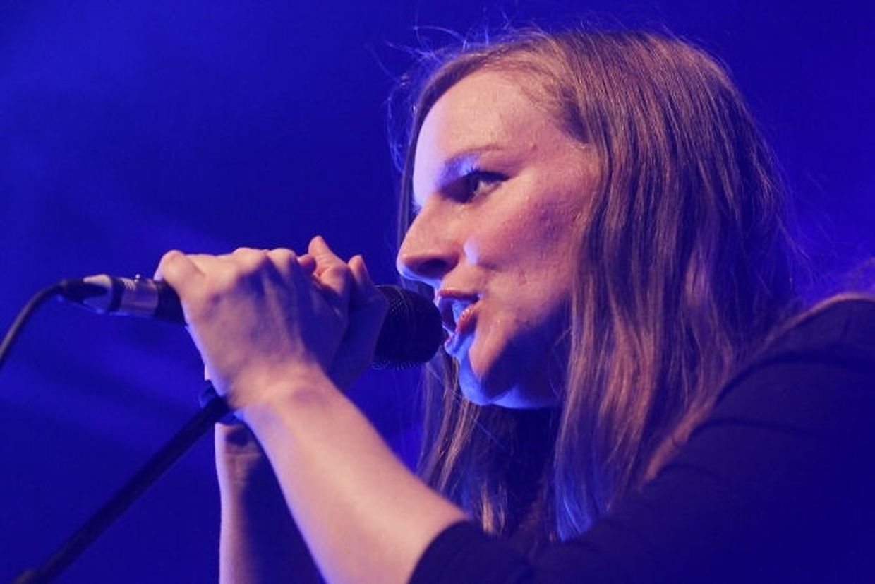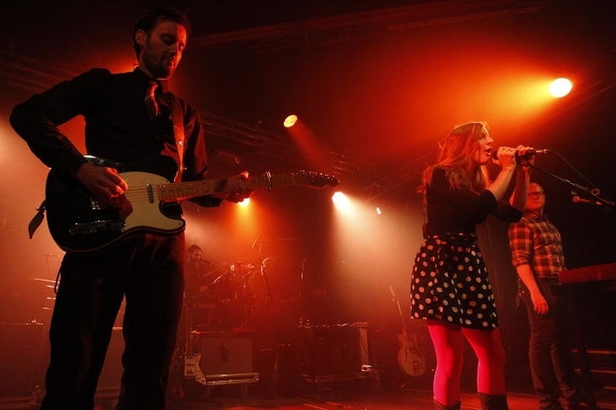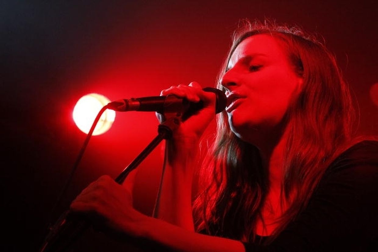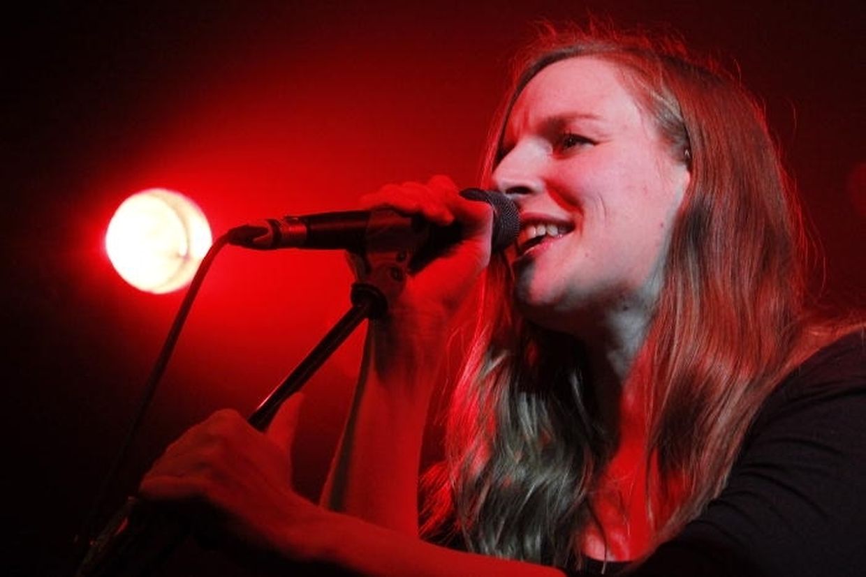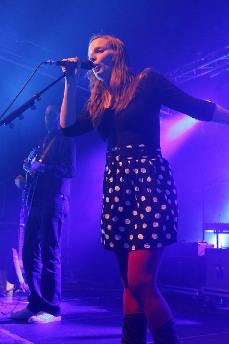 Schwarzer Rock mit weißen Punkten, rote Strumpfhosen, braune Stiefel, schwarzer Pulli und blondes Haar: So trat Sängerin Judith Holofernes im Atelier mit ihrer Band „Wir sind Helden“ auf die Bühne.