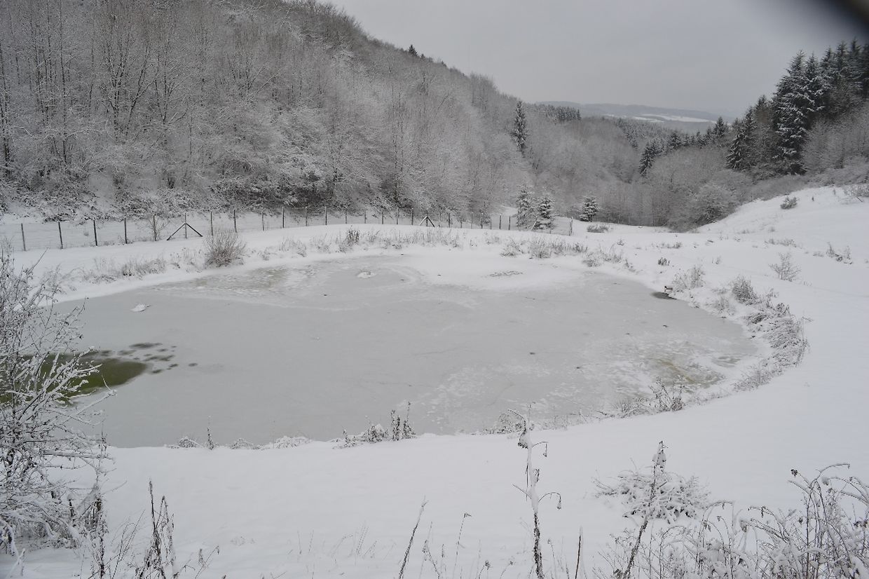 Auch der "Aale Weiher" ist zur Zeit komplett mit Schnee bedeckt.
