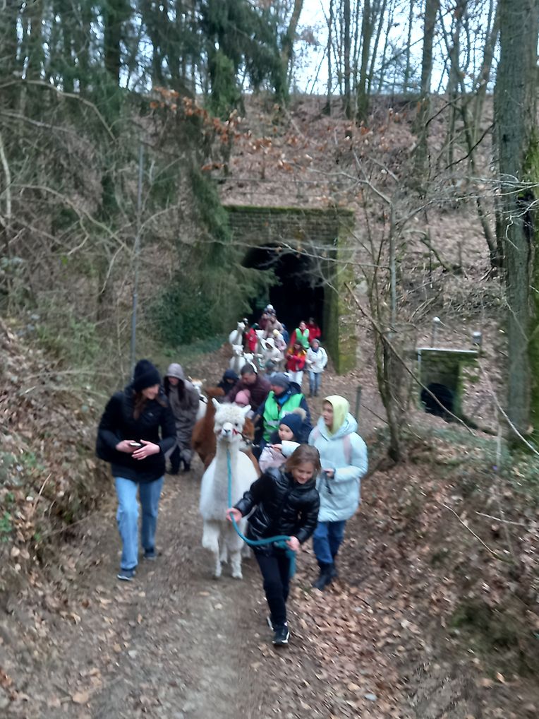 Nach der Begrüßung durch Al-Pako ging es gleich los, nonverbal erklärt Dany (Bauernhofpädagogin) wie ein Alpaka zu führen ist, auf was zu achten ist, wo das Tier herkommt war schwieriger zu erklären wegen der Sprachbarriere, auch Angstabbau vor dem Tier stand im Programm. Nach gegenseitigem beschnuppern und die erste Kontaktaufnahme mittels Futter ging es durch Waldwege rund um Hovelange Richtung Leitrange mit den Alpakas an der Leine. Die Ruhe im Wald, das ruhige Alpaka, das gemütliche Wandern war ein schöner Moment für die kleinen Alpakaführer. Das nahe sein, das Gemüt, die Verantwortung ein Tier zu führen war sicher für einige eine Herausforderung und nicht alltäglich.