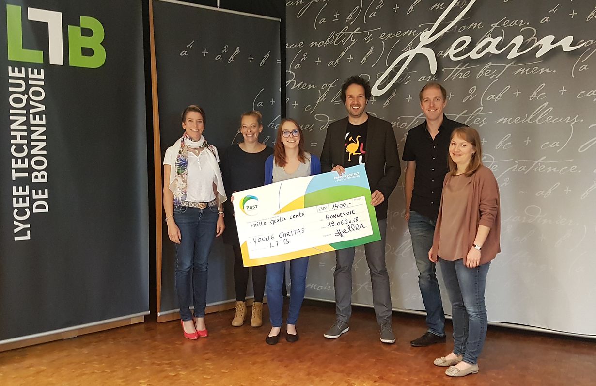 Comme le Lycée technique de Bonnevoie collabore depuis quelques années étroitement avec le département “Young Caritas” de la Caritas Luxembourg, ce fut une évidence de soutenir leurs projets et colonies de vacances afin qu’un maximum de jeunes puissent profiter de moments de convivialité et de détente. Les recettes d’une grande tombola, du LTBar, de la vente d’objets en bois réalisés en atelier et d’un marché aux livres “second-hand” ont permis de faire un don de 1400€ à Young Caritas. Le chèque a été remis à Monsieur Paul Galles qui est responsable de la coordination du bénévolat solidaire. Un grand Merci à tous ceux qui ont contribué à la réalisation de ce don.