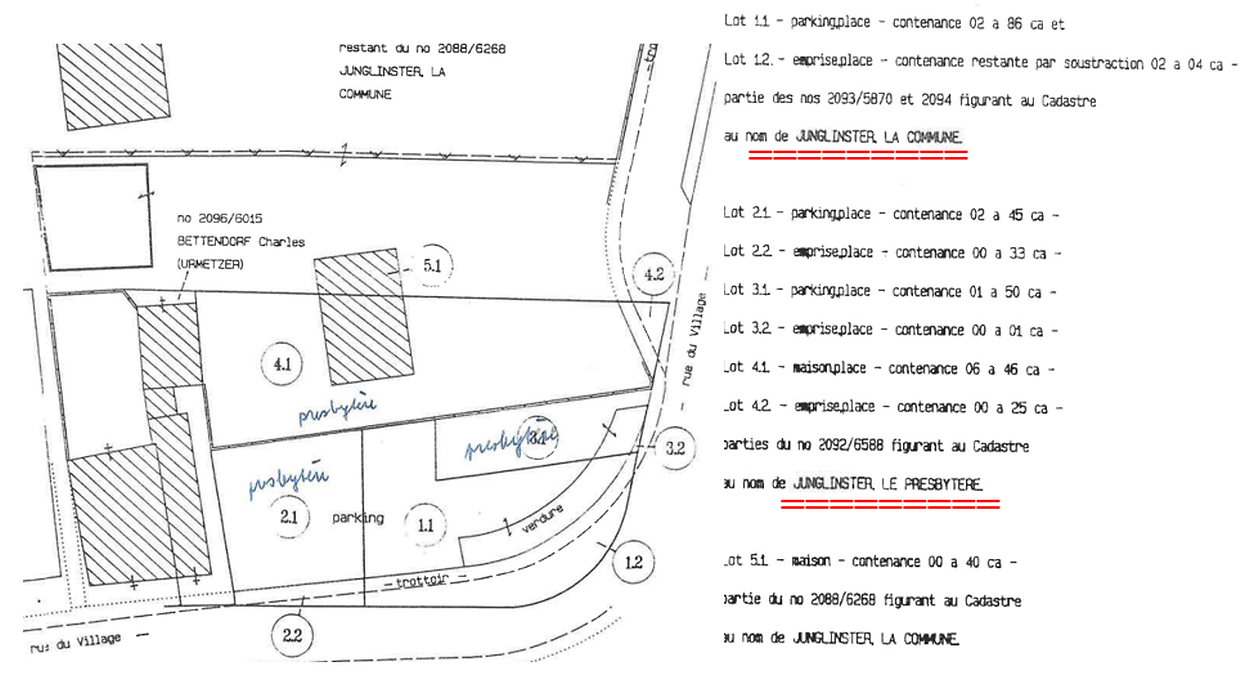 Im Jahre 1999 allerdings tauscht die Gemeinde mit der Kirchenfabrik die Parzelle 5.11 mit einem Teil des Pfarrhauses gegen andere Parzellen welche links vom heutigen Pfarrhaus liegen und 1973 als Eigentum der Gemeinde angesehen wurden. Dieser Tausch wurde dann auch beim Notar in Junglinster per Akt festgehalten. Im Kadaster steht seitdem sowohl Parzelle 5.11 aber auch Parzelle 4.11 als eine grosse Parzelle (2088/8026, JB de Junglinster) auf den Namen „Fabrique d’église“. Parzelle 4.11 wurde aber nicht im Akt von 1999 erwähnt und müsste somit noch immer als eigene Parzelle im Kadaster stehen und das auf den Namen „Presbytère“.