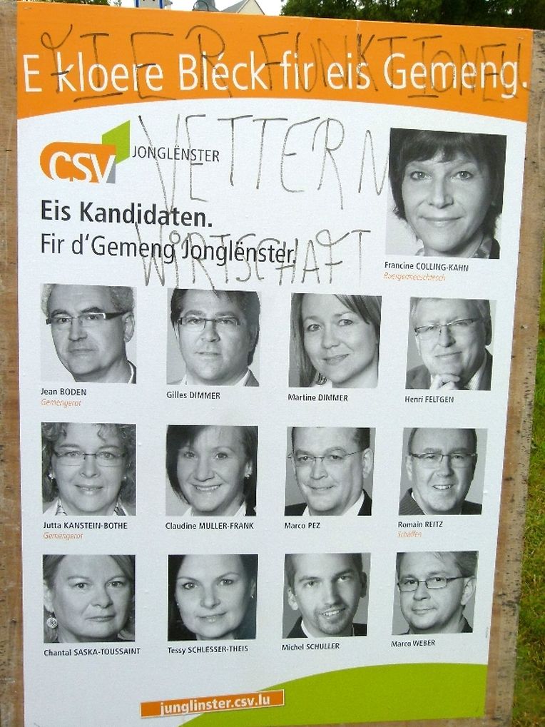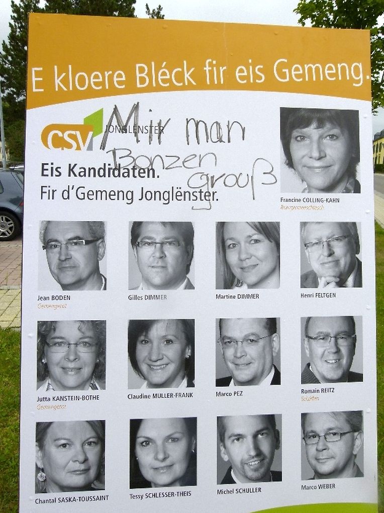 Leider konnte mer awer elo an deenen zwéi leschten Deeg feststellen, datt nu vu Leit, déi hirem Frust wëlle lass ginn, op eng net propper a feig Manéier d’Aarbécht vun de Parteien duerch den Dreck gezu gëtt duerch Schrëften a Gekritzels op den Affichen, also duerch Aktiounen, déi een net vu Leit erwaart, déi normal op de Walkampf vun de Parteien reagéieren. Haaptsächlech sinn et d’Plakater vun der CSV, déi beschmiert sinn. Wéi d’CSV elo matgedeelt huet, wëll si eng Plainte bei der Police maachen, wann nach iergend eng Zort vu Vandalismus op oder un de Plakate festgestallt gëtt.
