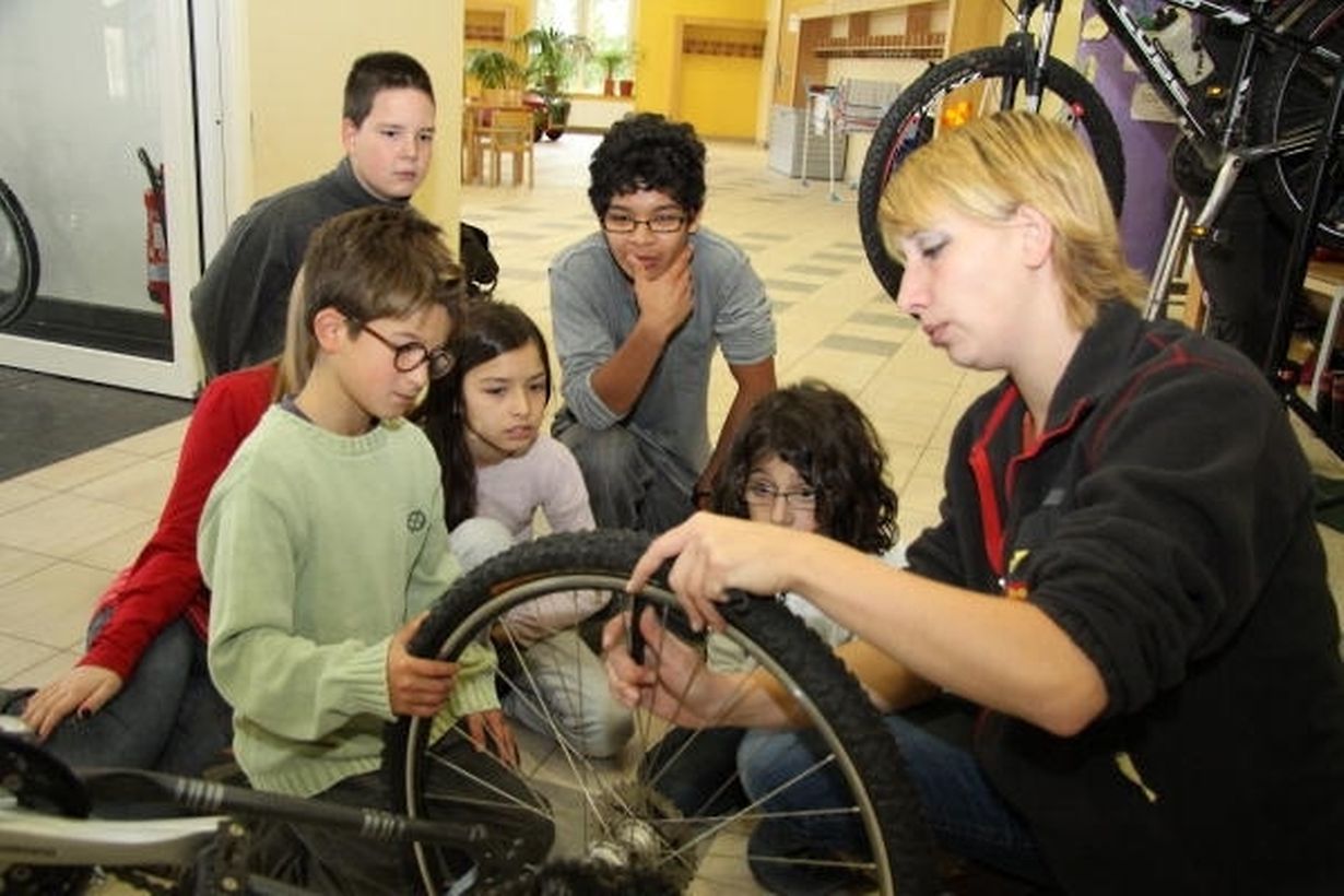 Das Thema Bewegung wurde dann auch während der Allerheiligenferien großgeschrieben. Unter dem Motto „Move your body“ konnten die Kinder der Zyklen 3.2 bis 4.2 an diversen Bewegungsaktivitäten teilnehmen. Zur Auswahl standen ein Ausflug ins Schwimmbad und in die Schlittschuhhalle, Fahhradfahren sowie eine große Zumba-Party. Aber auch technische Details standen auf dem Programm. So lernten die Heranwachsenden auch, in Kooperation mit dem in Junglinster ansässigen Baumarkt, wie sie ihr eigenes Fahrrad im Fall einer Panne reparieren können. Konzentriert hörten sie dann auch den nötigen Erklärungen zu, bevor sie selbst das Fahrrad einstellen konnten, einen Platten flicken und die Fahrradkette reparieren durften.