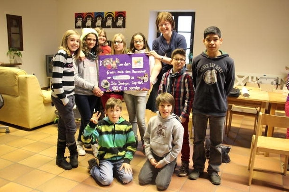 Mit Hilfe ihrer Erzieher luden die zehn- bis zwölfjährigen Kinder ihre Eltern auf einen Adventsnachmittag ein, wo sie ihnen Plätzchen, Kuchen, Kastanien und heiße Getränke anboten und sie um eine kleine Spende baten. Am Ende des Nachmittages waren 180 Euro zusammengekommen, die für das SOS-Kinderdorf in São Domingos auf den Kapverdischen Inseln bestimmt sind. Vor kurzem fand nun die Schecküberreichung in der „Baltesscheier“ in Junglinster statt. Dabei präsentierte Stéphanie Wies, Beauftragte für entwicklungspolitische Bildungsarbeit bei „SOS Villages d’enfants monde“, eine Diashow mit Fotos vom SOS-Kinderdorf in São Domingos und stand den Kindern Rede und Antwort.