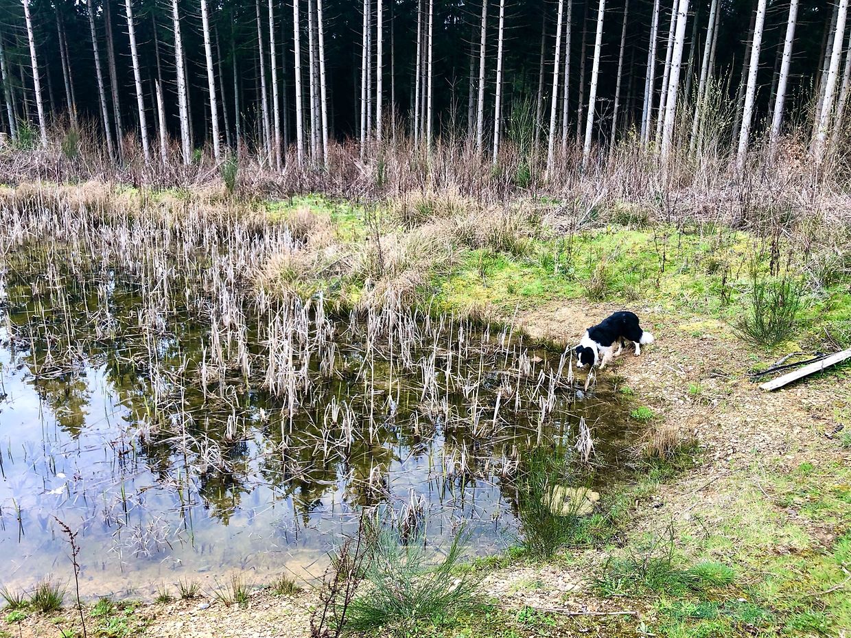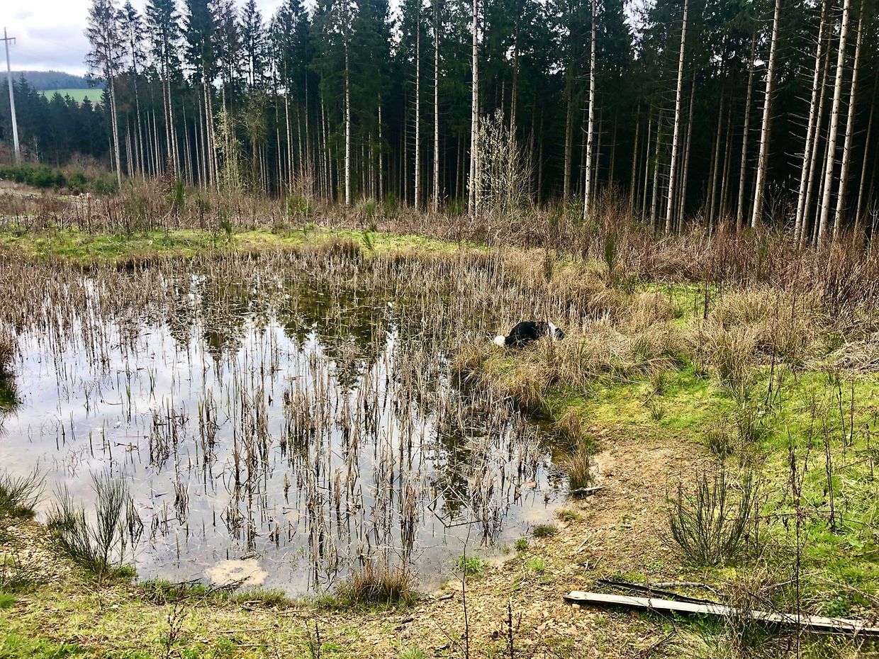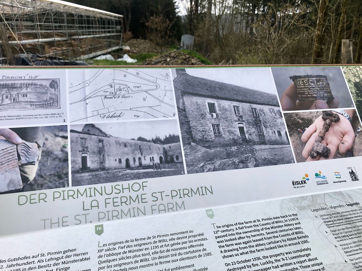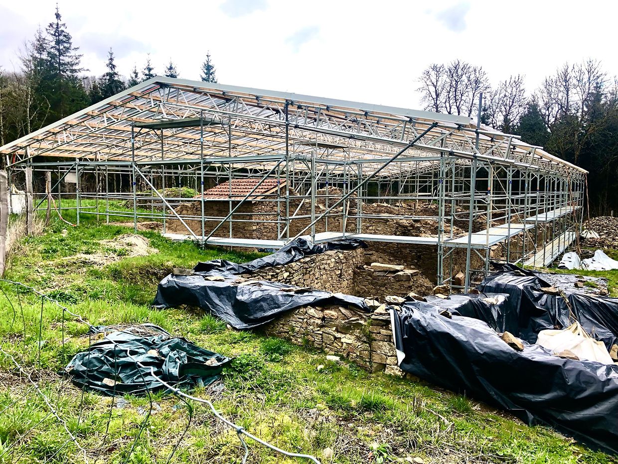 Zunächst wurde der Stall in der Mitte des Wirtschaftskomplexes vollständig freigelegt. Dieser schmale langrechteckige Raum war sowohl an seiner westlichen Längsseite vom 2021 teils freigelegten westlichen Raum erreichbar als auch von der Hofseite. Ein Durchgang in der südöstlichen Ecke zum östlichen Stallraum scheint sehr spät geschaffen worden zu sein. Die Nutzung des Stalls lässt sich auf den ersten Blick in zwei Phasen einordnen. In jüngerer Zeit diente er als Schweinestall. Über der alten Pflasterung wurde ein Pflaster aus Ziegelsteinen verlegt, lediglich eine schmale Gasse an der westlichen Mauer blieb frei. Der Raum wurde dann in vier Räume eingeteilt. Der größte erstreckt sich im hinteren Bereich über die gesamte Raumbreite, drei weitere sind gleichmäßig an der östlichen Raumseite gelegen. Die ungefähr brusthohen Trennmauern sind aus Zementziegeln gemauert und die Wände mit Zementmörtel verputzt. Steinzeug Tröge wurden in den Mauern an der Stallgasse miteingemauert, so konnten die Schweine von innen fressen und der Bauer von außen Futter reinschütten.