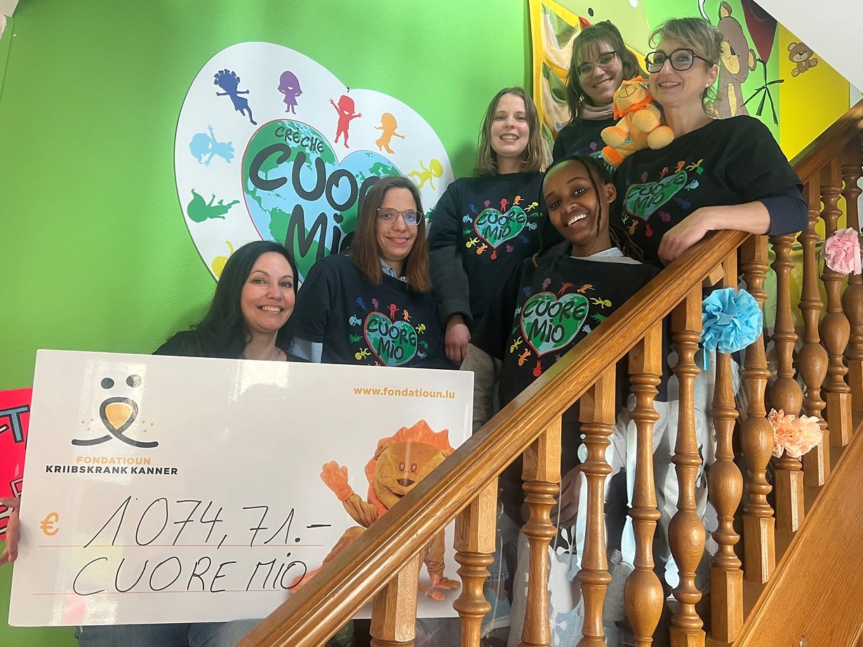 D'Personal an Directrice vun der Crèche "Cuore Mio" vun Kayl sinn ganz engagéiert wann et heescht eppes fir den gudden Zweck ze maachen. Sie schaffen an bastelen vill mat hiren klengen Butzen fir dann flott Saachen ze maachen, déi si dann och kënnen verkafen. Mat dësem risegen Engagement hunn si esou konnten der Fondatioun Kriibskrank Kanner een Scheck iwwerreecht vun 1.074,71 €. www.fondatioun.lu