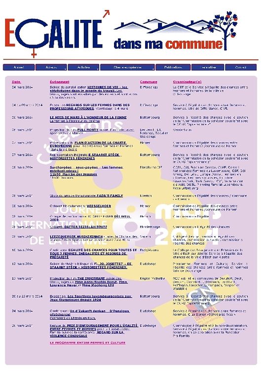 Le Conseil National des Femmes du Luxembourg (CNFL) publie le programme des événements organisés du 4 au 26 mars pour célébrer la journée de la femme le 8 mars. Dans le cadre de l'action « l’Egalité dans ma commune », les communes luxembourgeoises se sont mobilisées pour proposer des manifestations en faveur de l’égalité : des concerts, des projections de films, du théâtre, des expositions permettront à chacun de découvrir le chemin parcouru et celui restant encore à parcourir dans le domaine de l’égalité entre les femmes et les hommes. Des conférences sur le thème de l’égalité viennent compléter ce programme et donneront lieux à des échanges avec le public. Retrouvez le programme sur www.cnfl.lu/communes