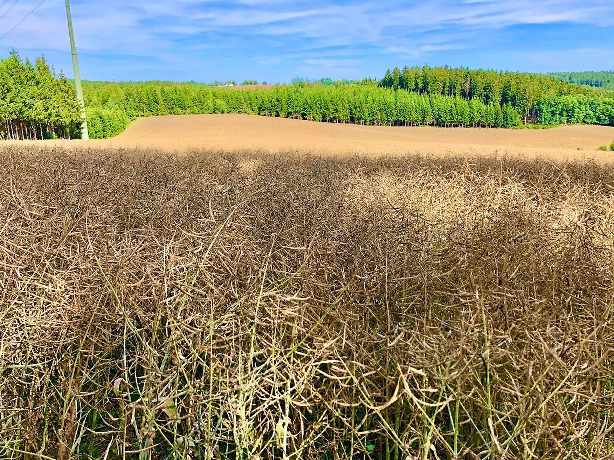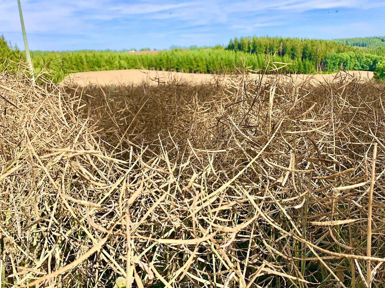 Ungefähr zwei Monate nach der Blüte wird der Raps im Juli reif für die Ernte. An Stelle der Blüten stehen nun dünne bräunliche Schoten, die bis zu zehn Zentimeter lang sind. Darin liegen 15 bis 18 etwa millimetergroße, kugelige Samen. Bei voller Reife sind die Samen schwarz und die Schoten eingetrocknet.