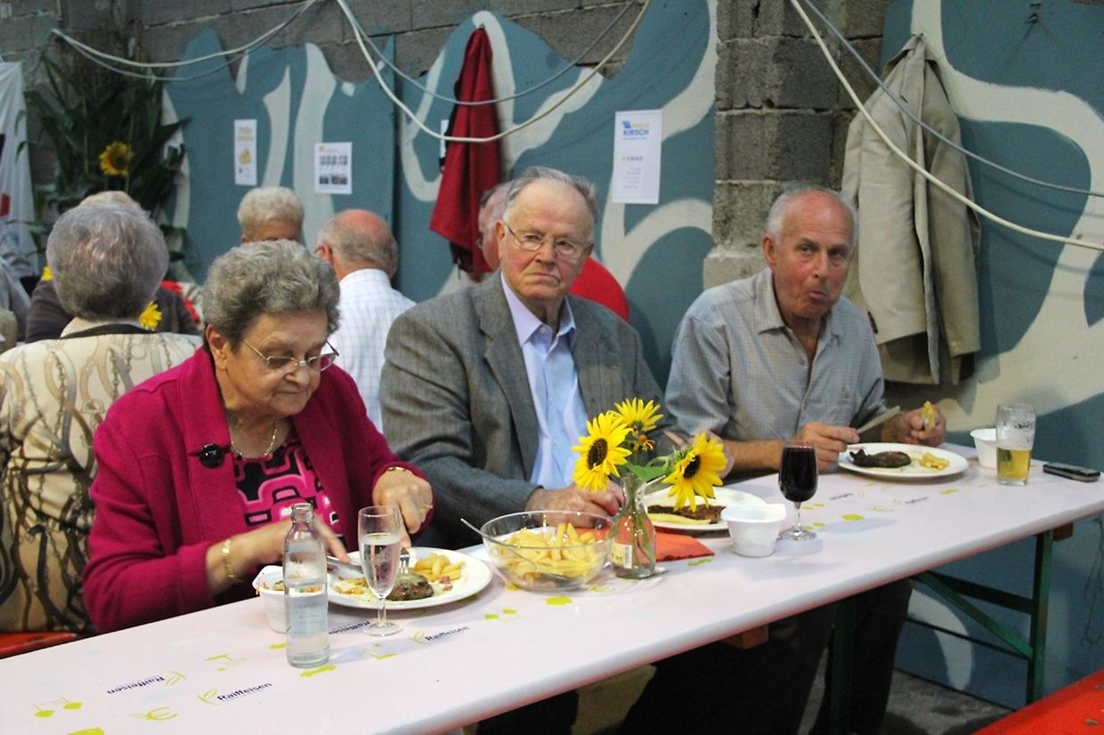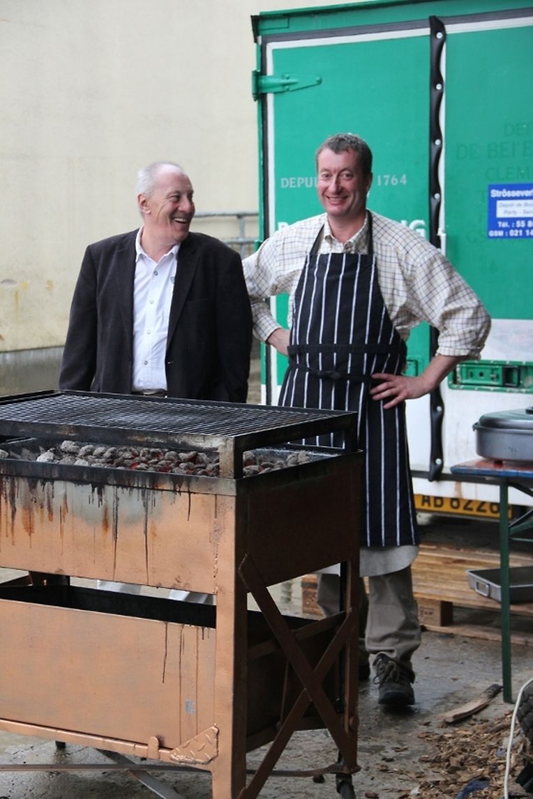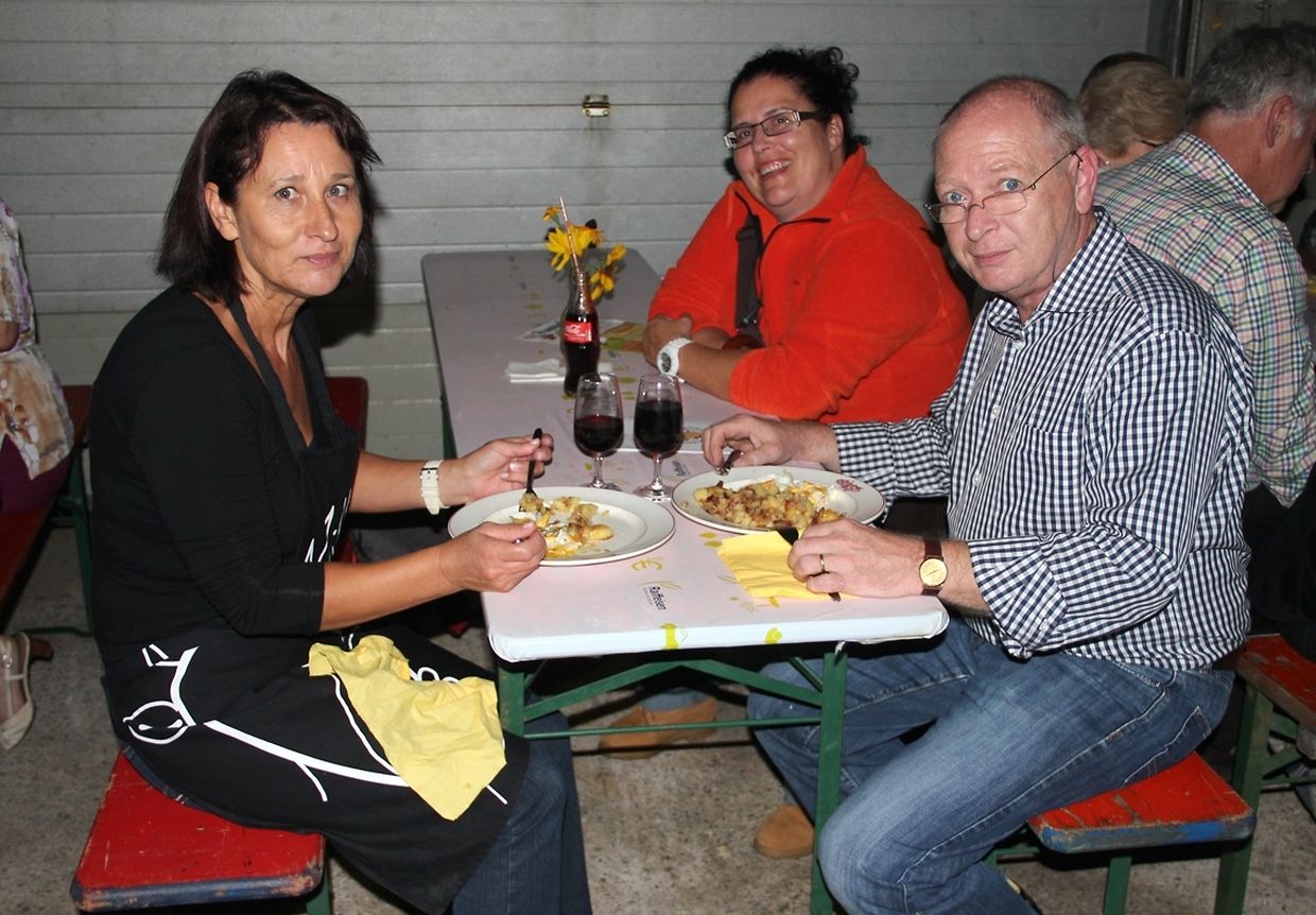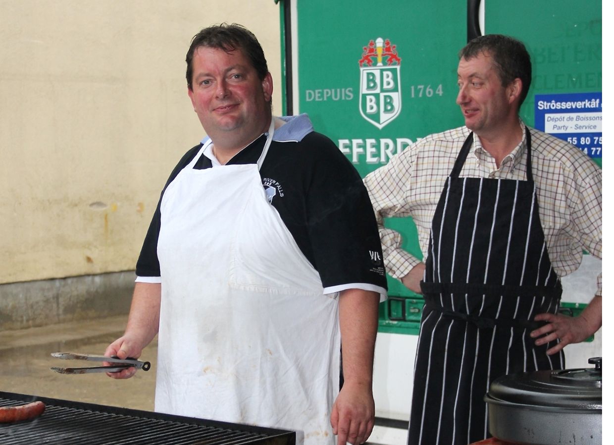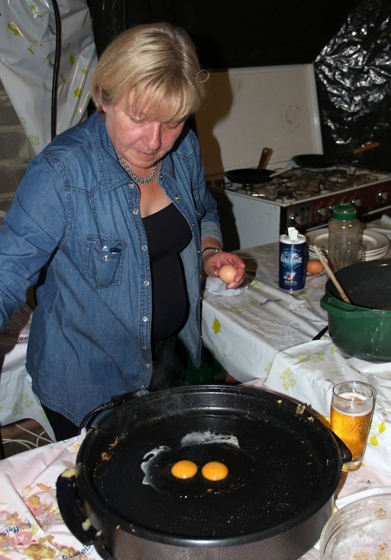 Nom 1. Schäffe senger Ried kruten dunn eis hongreg (an duuschtereg) Gäscht Frällen, Entrecôten, Koteletten, allerhand Wipp an duerno e gudden Eisekuch zervéiert. Fir owes hate mir, wéi ëmmer, eng extra Schlabäizchen op der Kaart: Féngiger Spigeleeër mat gebrode Féngiger Gromperen. D'Leit lecken sech elo nach d'Fangeren drun.