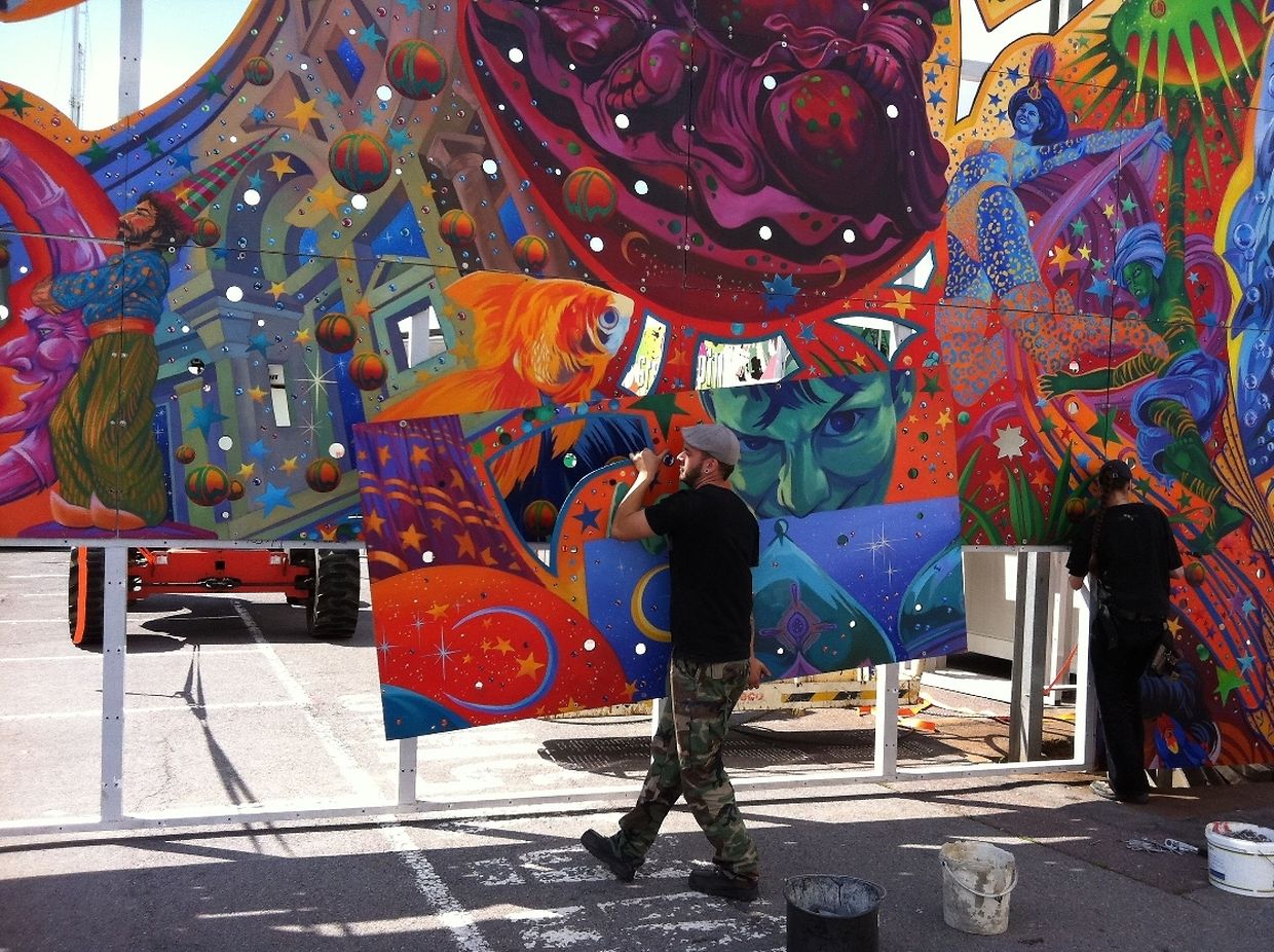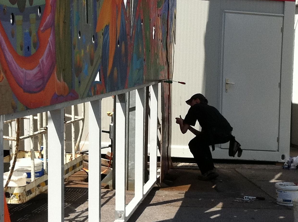 Das Eingangsportal ist zusammengesetzt aus 80 gemalten Sperrholz- Platten die auf einer Aluminiumstruktur befestigt sind, das Ganze entsprechend den letzten Regelungen, auch was die Windlast betrifft. Das Motiv von 2007 soll übrigens auch noch 2012 verwendet werden.