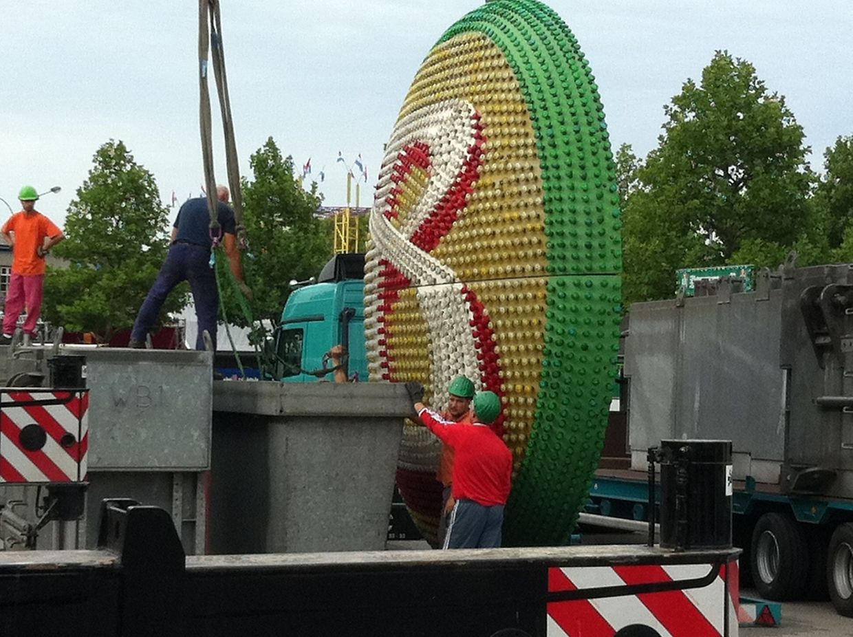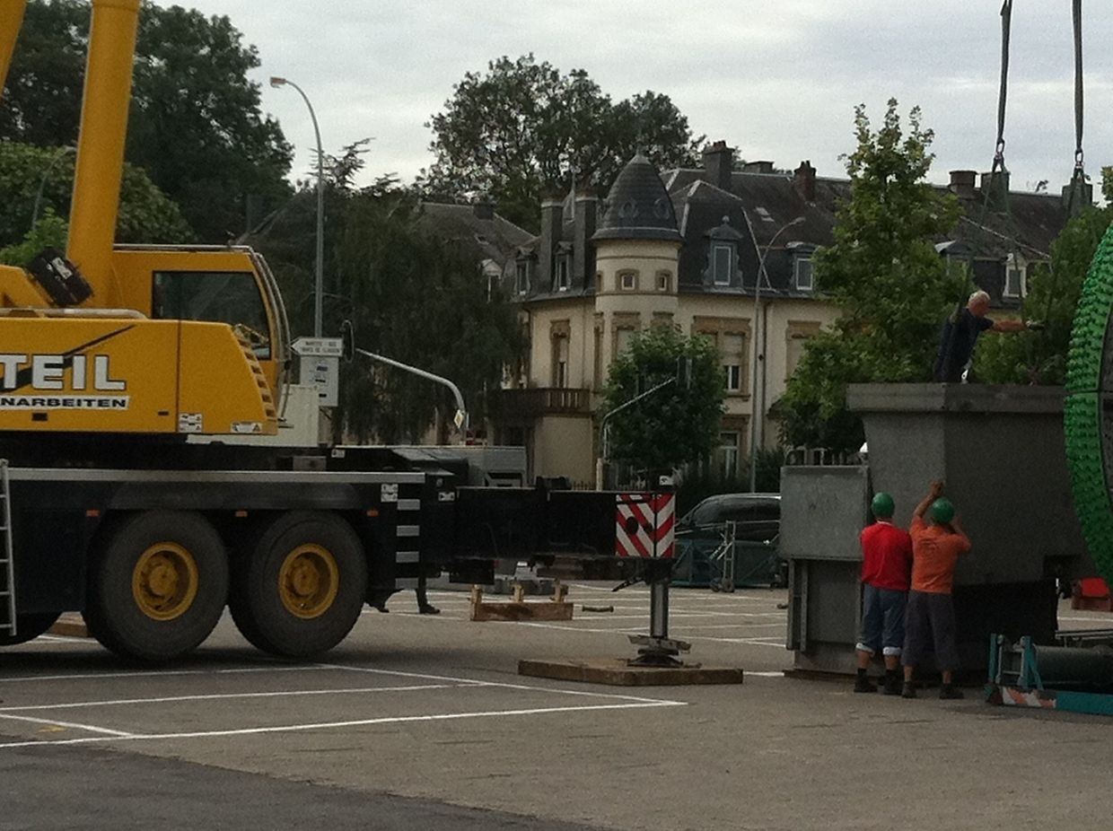 Hier wird nicht gekleckert, hier wird richtig geklotzt: Das Bellevue-Riesenrad ist da! Soeben erst aus dem deutschen Herne gut verpackt angereist wird der Stahlkoloss in Luxemburg innerhalb von zwei Tagen wieder auf die Beine gestellt.