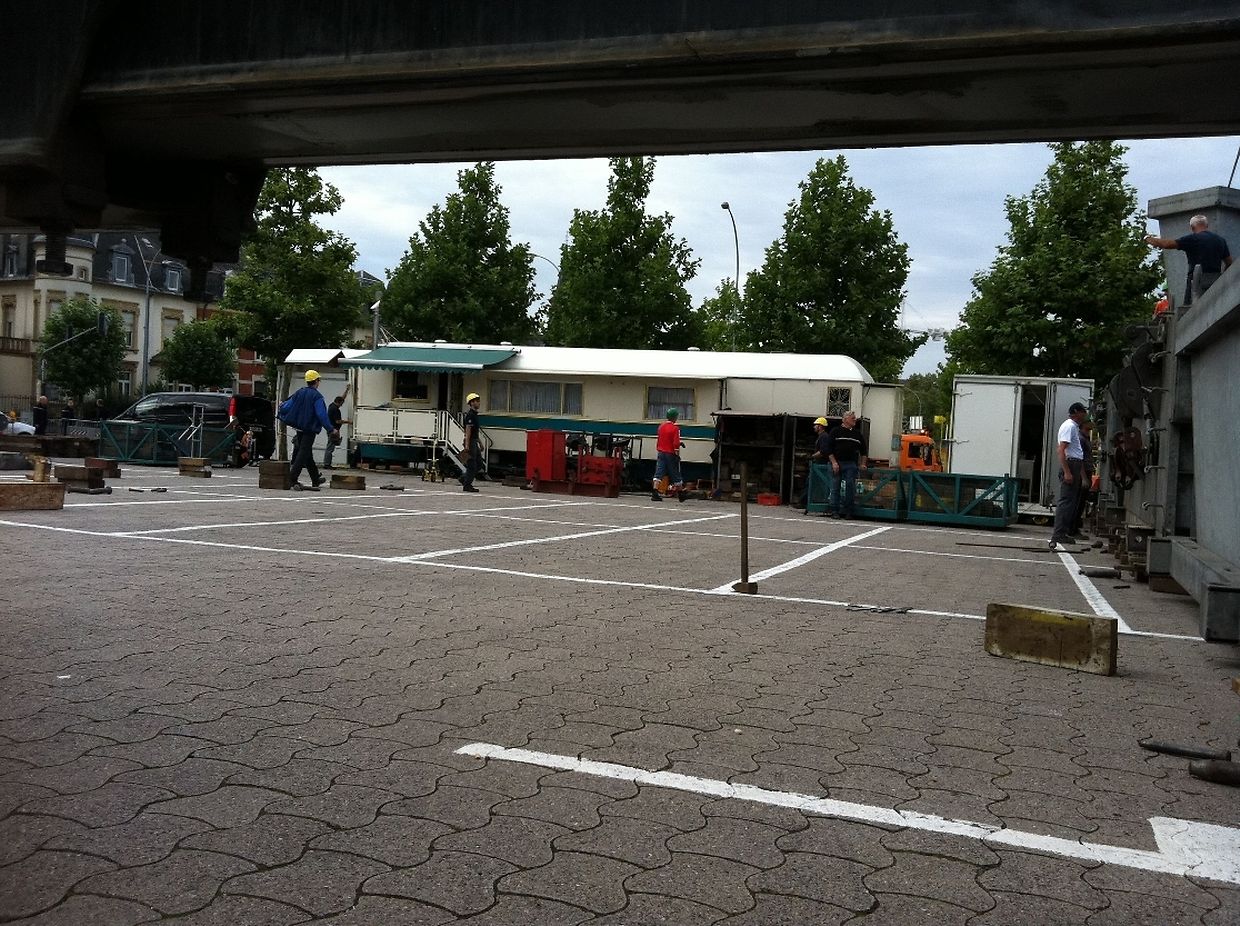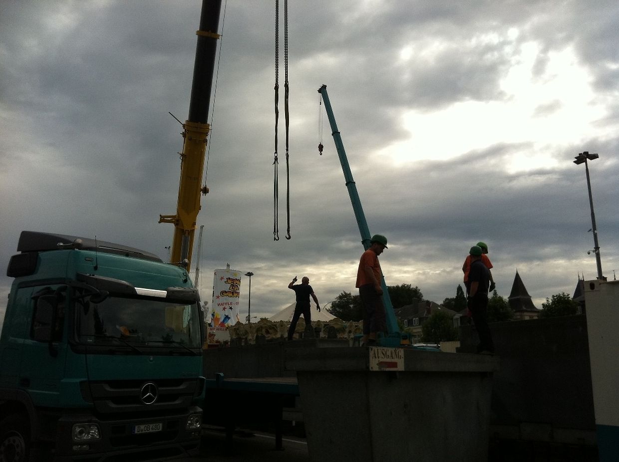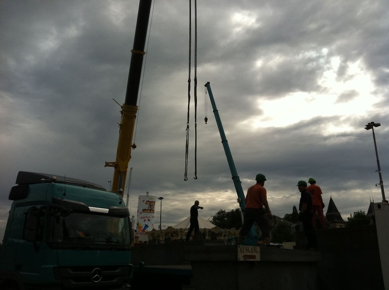 Am Montag rollten die ersten Lastwagen mit dem tonnenschweren Gerät herbei, und seit Dienstag wird mächtig aufgerüstet. 16 schwerbeladene Lkws, ein eigener Firmenkran und zusätzlich noch ein 160-Tonnen-Leihkran und ein Traktor, dazwischen ein Wohnwagen und eine Schaustellerfamilie mit zwei Hunden und einigen Kindern.