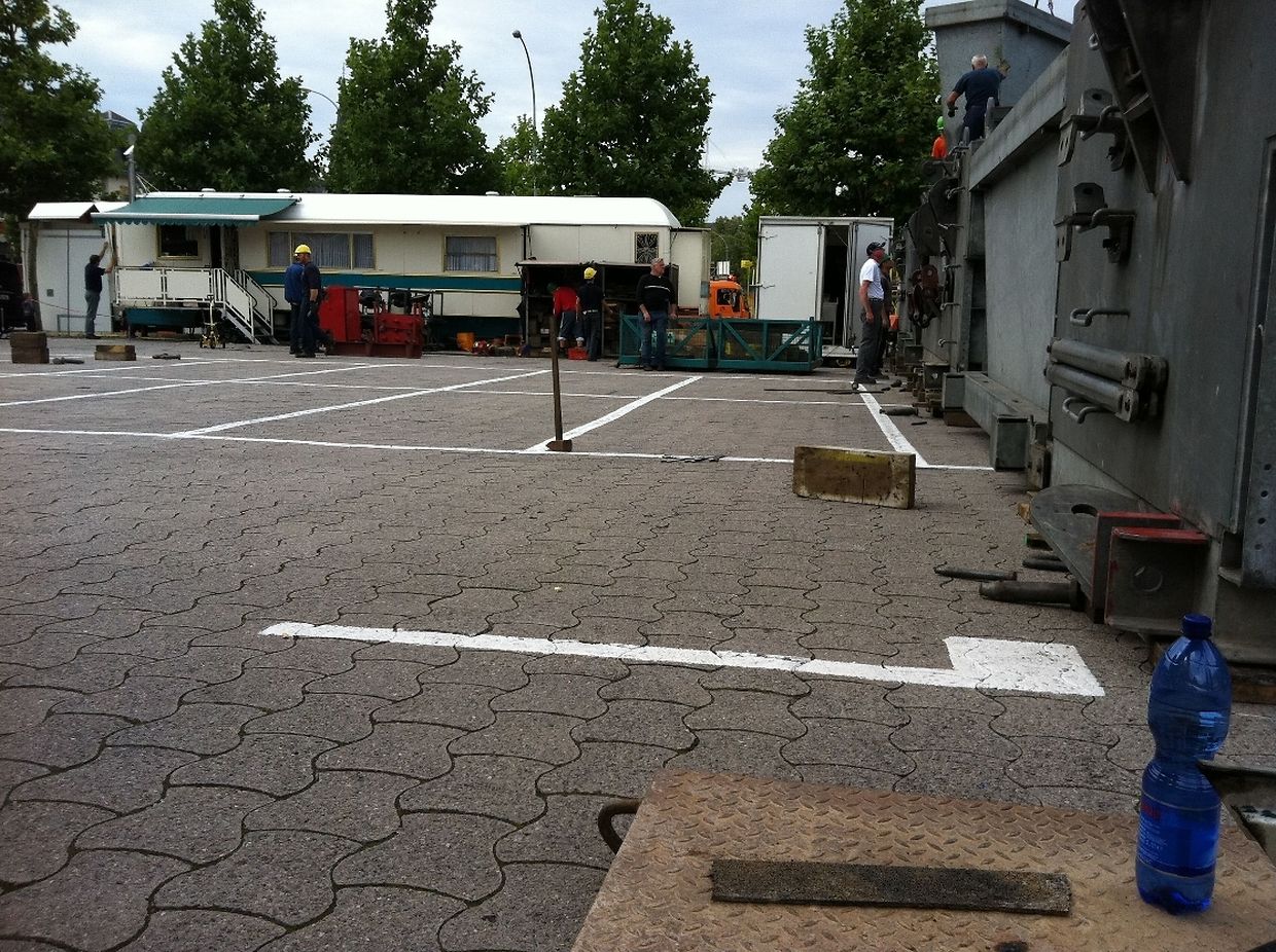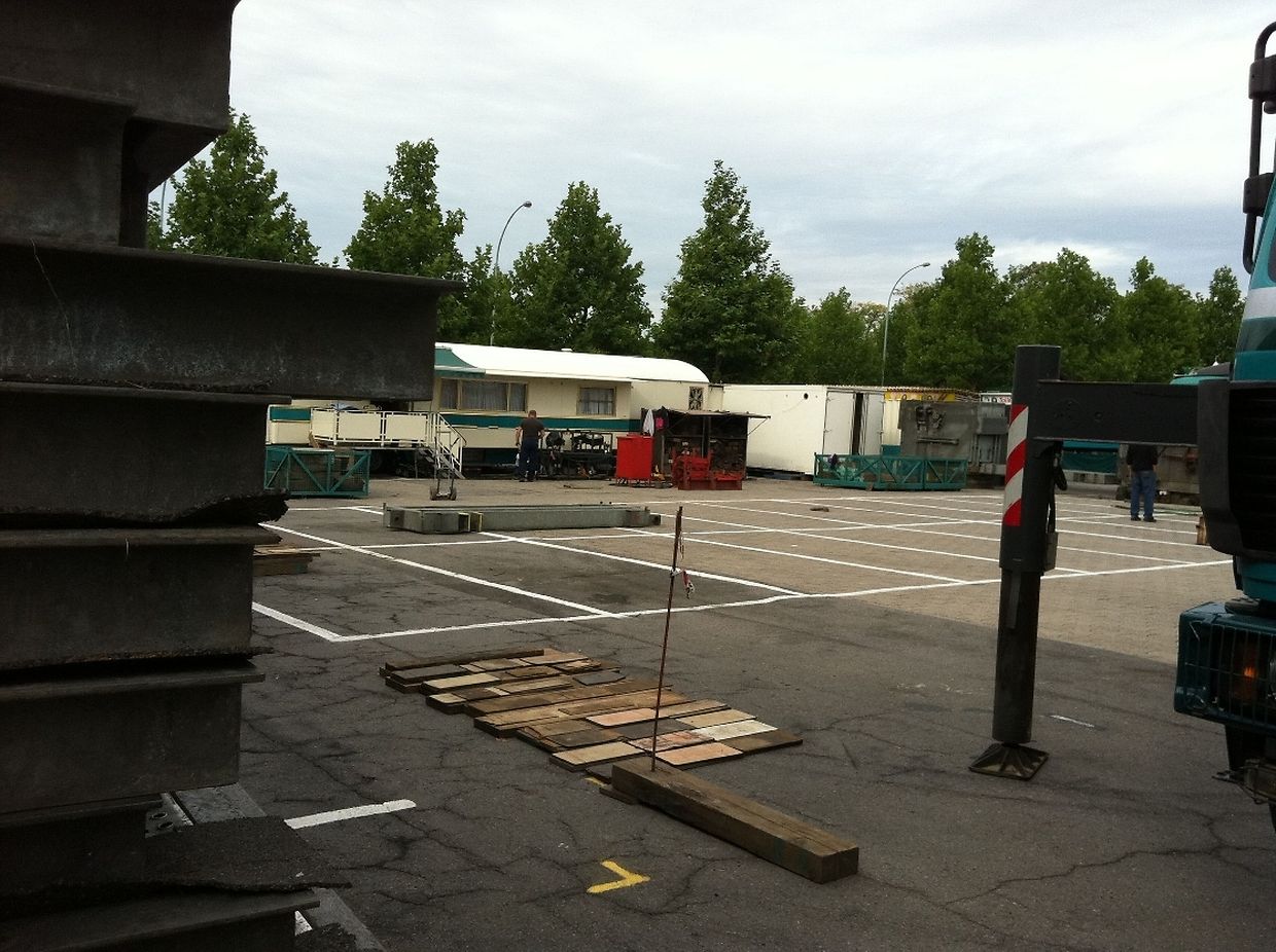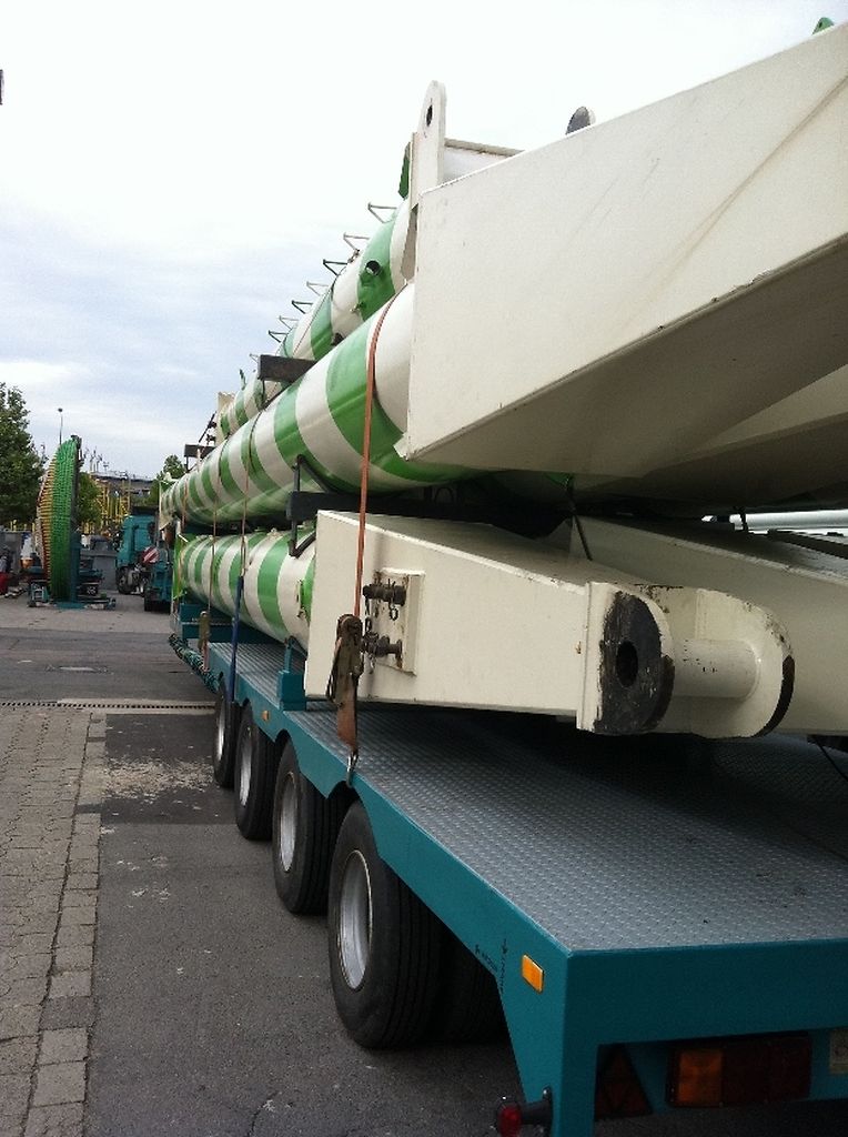 Am Montag rollten die ersten Lastwagen mit dem tonnenschweren Gerät herbei, und seit Dienstag wird mächtig aufgerüstet. 16 schwerbeladene Lkws, ein eigener Firmenkran und zusätzlich noch ein 160-Tonnen-Leihkran und ein Traktor, dazwischen ein Wohnwagen und eine Schaustellerfamilie mit zwei Hunden und einigen Kindern.
