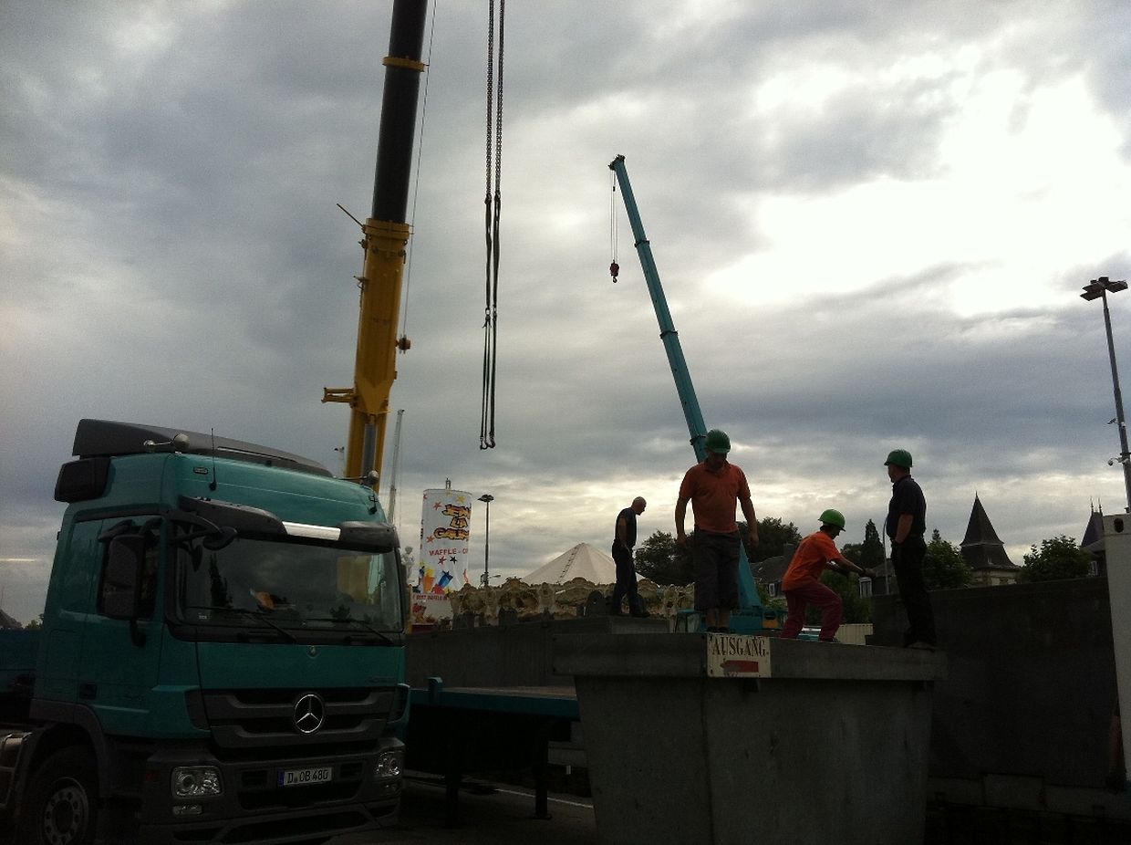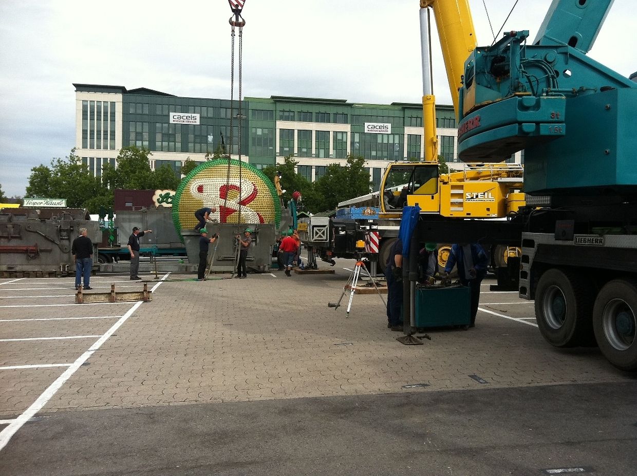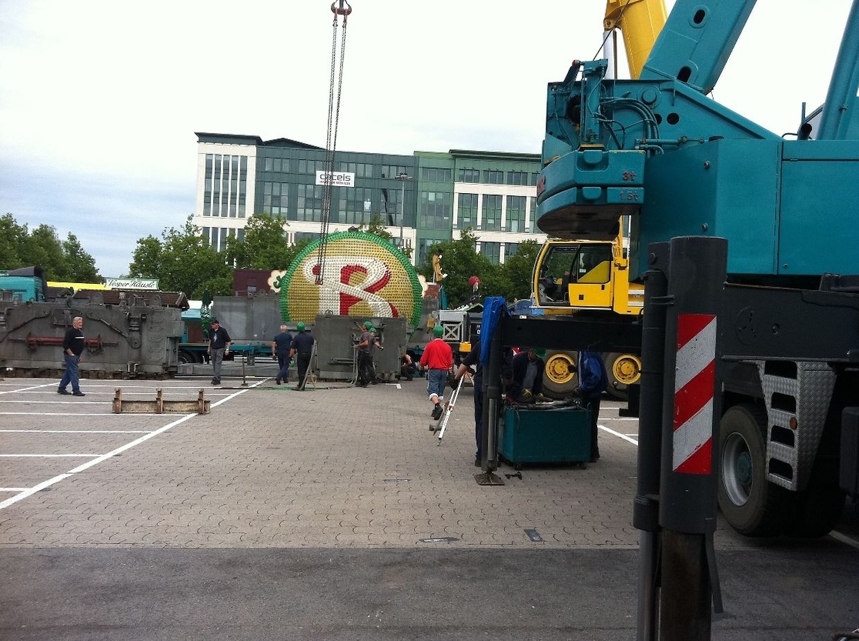 Bis Montag war der Stellplatz für das Riesenrad auf dem Glacisfeld noch gähnend leer, nun wird dort lauthals geschrien – mit einem slawischen Akzent wohlgemerkt! Denn auch wenn das Riesenrad von einer alten deutschen Kirmesfamilie betrieben wird, so stammen die Montagearbeiter hauptsächlich aus dem Osten. Das Team – 16 Mann - ist eingespielt. Jeder weiß, wo welches Stück hin muss, bis das 56 Meter hohe Rad endlich die Stadtsilhouette prägen wird.
