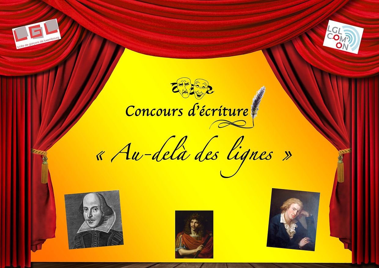 Le concours d’écriture « Au-delà des lignes », lancé pour la première fois cette année au LGL et soutenu par le projet d’établissement LGL Com’On, a véritablement obtenu un grand succès. Le jury étant composé par Mesdames Stéphanie Altwies, Stéphanie Duchaine, Janine Goedert et Coryse Simon remercie chaleureusement tous les participants du concours qui se sont avérés nombreux, à savoir 39 élèves de tout niveau et de tout âge.