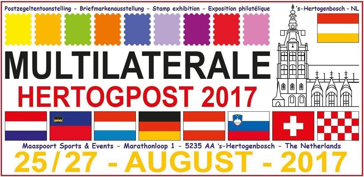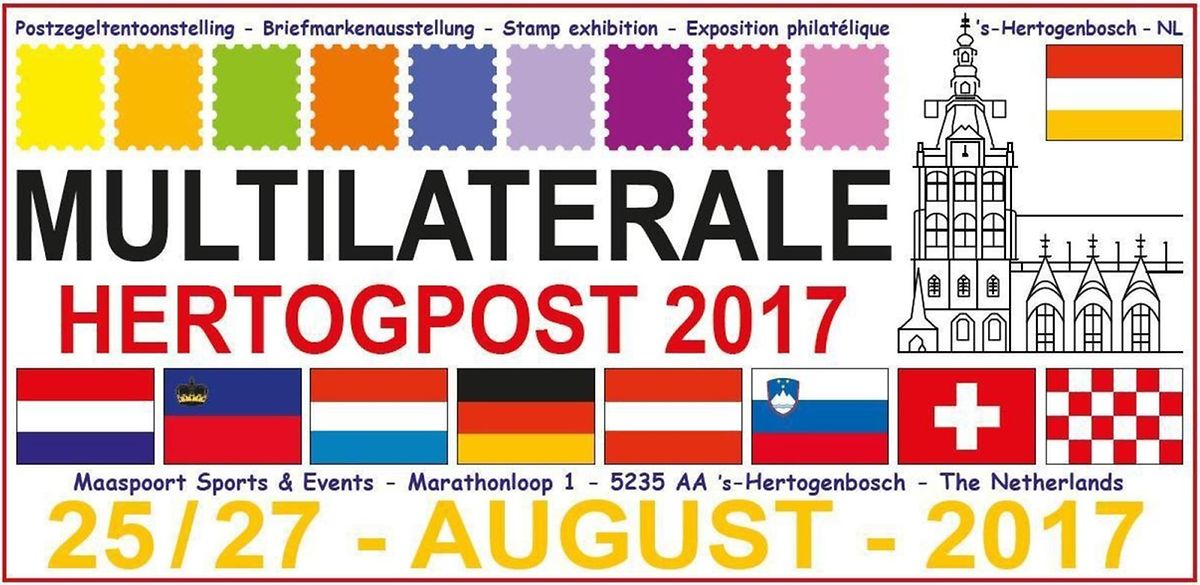 Die Multilaterale Briefmarkenausstellung "Hertogpost 2017" findet vom 25.08. bis 27.08. 2017 in der Maaspoort Sports & Events Halle in ´s-Hertogenbosch (NL) statt. Sie wird vom Koninklijke Nederlandse Bond van Filatelistenvereinigingen als Wettbewerbsausstellung im Rang 1 durchgeführt. Ausrichter ist die Stichting Hertogpost in ´s-Hertogenbosch. Die Ausstellung wird aus Mitteln der Stichting GSE & Stichting Filatelie unterstützt. Sie wird nach der Ausstellungsordnung, den Durchführungsbestimmungen und den Bewertungs Reglemente des KNBF in der jeweils neuesten Fassung zum Zeitpunkt des Anmeldeschlusses durchgeführt.