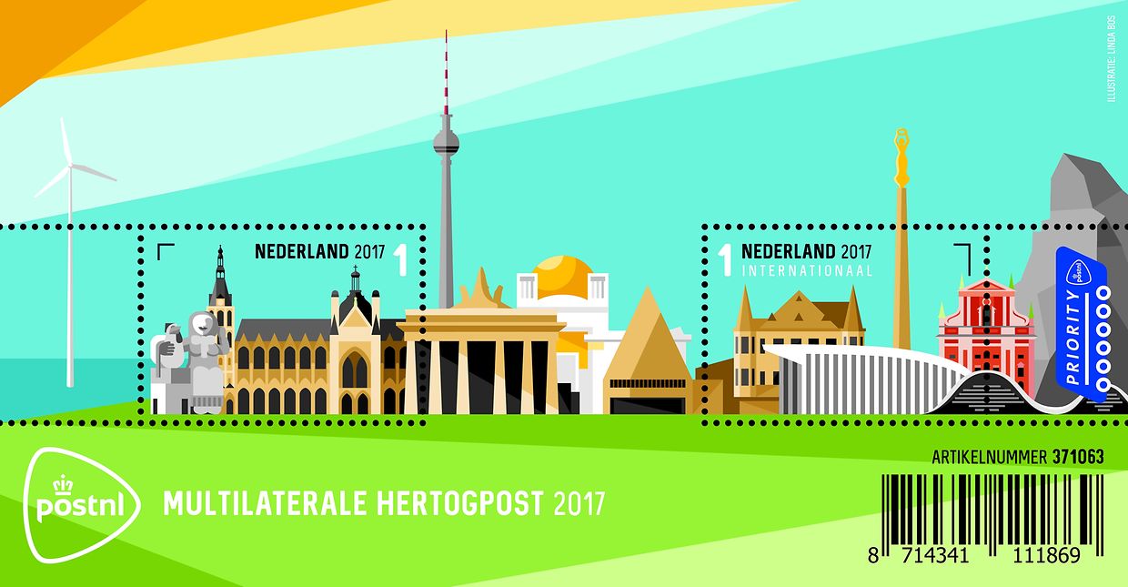 Die Grafikerin & Illustratorin Linda Bos, in den Niederlanden geboren und in Luxemburg lebend, hat eine Illustration angefertigt, die die sieben Länder der Multilaterale einbezieht, mit Schwerpunkt auf den Niederlanden und Luxemburg. Aus einer Auswahl an berühmten Der Block wird jedem Briefmarkenabonnent einzeln zugesendet werden. Er kann nicht einzeln erworben werden. architektonischen Wahrzeichen hat sie eine schöne Mischung an bemerkenswerten alten und modernen Gebäuden geschaffen.