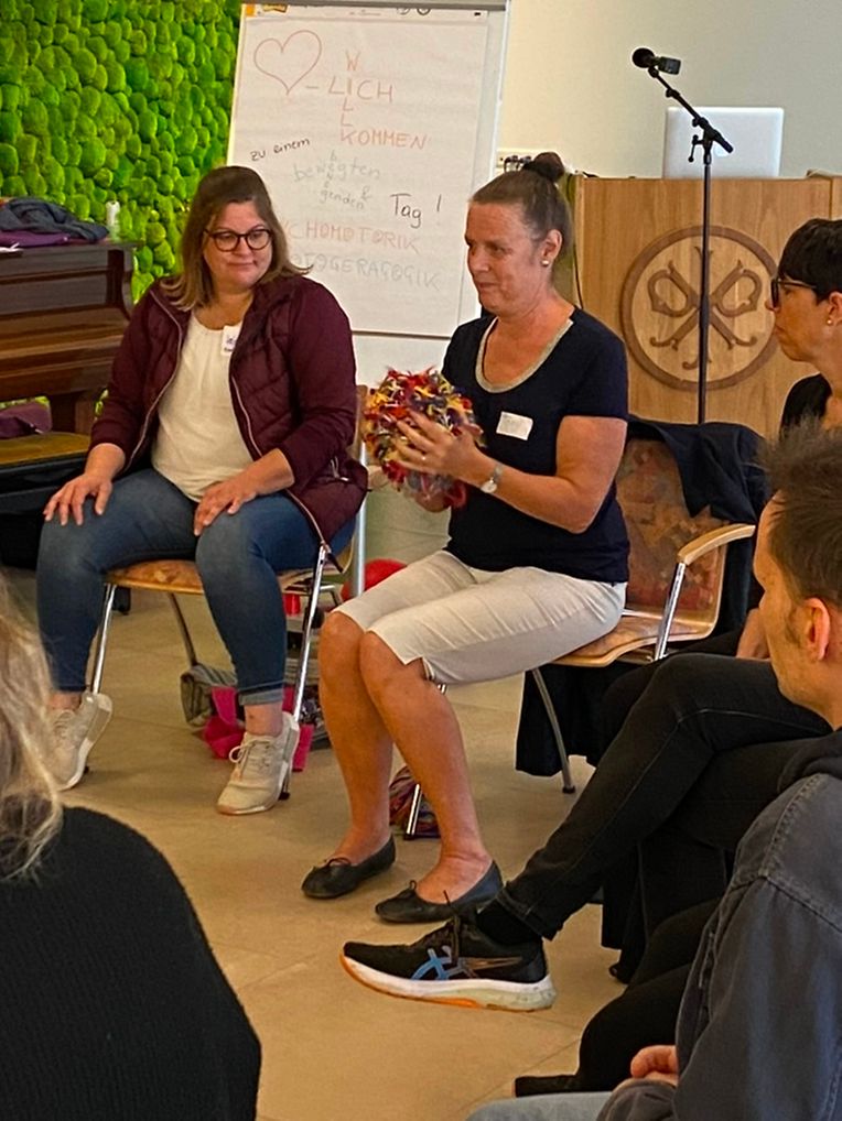 In ihrem Seminar „Bewegte Brücken“ oder „Bewegte Begegnungen“ stellte Frau Thesi ZAK (Wien) Motopädagogin und Motogeragogin, Buchautorin, spezialisiert auf die psychomotorische Begleitung von Menschen mit Mehrfachbehinderung und Demenz, Humor-Coach in der psychomotorischen Entwicklungsbegleitung Beispiele psychomotorischer Aktivierung des Selbsterlebens und motogeragogischer Angebote vor, die dazu beitragen, freudvoll und erfolgreich in Bewegung zu kommen sowie Beziehung zu gestalten.