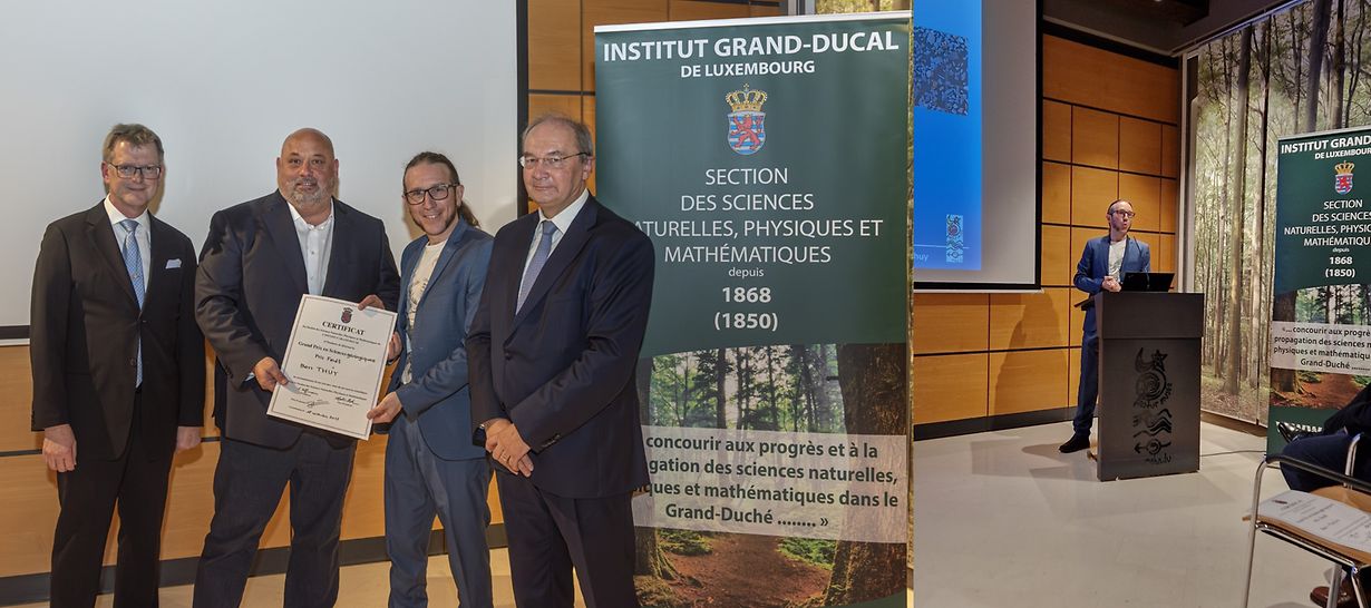 Le Grand Prix en Sciences géologique a été remis par la Section des Sciences de l’Institut Grand-ducal samedi dernier 18 novembre 2023 au Dr Ben Thuy, curateur en paléontologie au Musée national d’histoire naturelle dans le cadre d’une séance académique. Le Grand Prix en Sciences géologiques sponsorisé à hauteur de 5.000 euros par les Carrières Feidt s.a. a été décerné au Dr Ben Thuy pour l’ensemble de ses travaux grâce auxquels il a acquis au fil des années, une expertise internationalement reconnue dans l'étude du registre fossile des ophiures et d'autres échinodermes pour explorer les tendances de l'évolution et de la biodiversité au cours de l’histoire de la Terre. « L’Institut Grand-ducal est très fier d’avoir pu distinguer un remarquable chercheur luxembourgeois des sciences géologiques, en particulier en paléontologie, qui a contribué significativement à l’avancement de nos connaissances sur le groupe des échinodermes fossiles, mais aussi à la découverte du patrimoine naturel luxembourgeois » déclare Lucien Hoffmann, Président de la Section des Sciences naturelles, physiques et mathématiques.