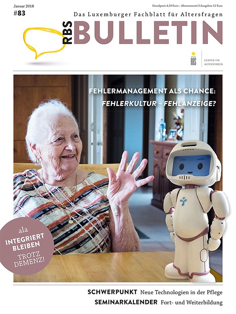 Die neue Ausgabe des Luxemburger Fachblatts für Altersfragen ist da. Das Magazin greift aktuelle Themen der Pflege auf. Es erscheint mit einer Auflage von 1500 Exemplaren dreimal im Jahr und richtet sich an Führungskräfte und Mitarbeiter in der professionellen Altenhilfe. Das Fachblatt veröffentlicht Artikel und Interviews zu aktuellen Tendenzen der luxemburgischen und europäischen Alten-, Pflege- und Sozialpolitik sowie Beiträge aus den Sachbereichen Gerontologie, Geriatrie und Sozialmanagement. Im Fortbildungskalender des Magazins werden die aktuelle Übersicht und Anmeldeformulare zu Veranstaltungen und Seminaren präsentiert. Die Januarausgabe bietet den Lesern u.a. einen interessanten Überblick zum Einsatz neuer Technologien in der Altenhilfe. Weitere Themen finden Sie im Inhaltsverzeichnis.
