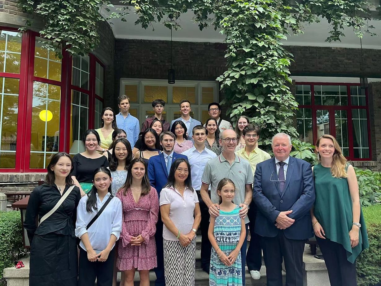 Le groupe de l’Athénée avec l’ambassadeur Marc Hübsch, son épouse et sa fille et le chef de mission adjoint Luc Scholtes.