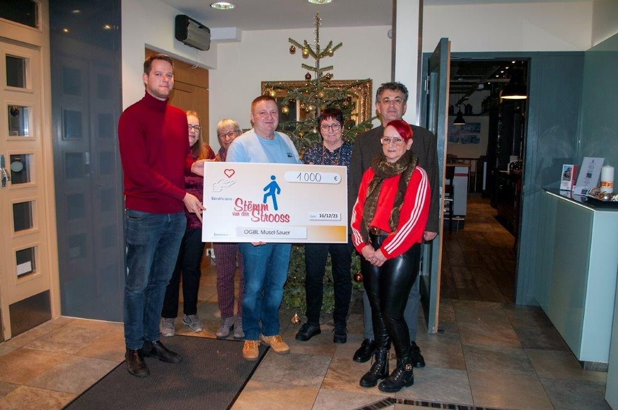 Le 16 décembre, la section OGBL Musel-Sauer a remis le chèque à la Stëmm vun der Strooss, représenté par son chargé de communication Bob Ritz, qui a profité de de cette rencontre pour présenter les différentes activités et domaines d'intervention que l’asbl propose à ses bénéficiaires. La remise de don s’est déroulée dans une ambiance conviviale et autour de petits mets au restaurant Simon’s Plaza au Potaschberg.