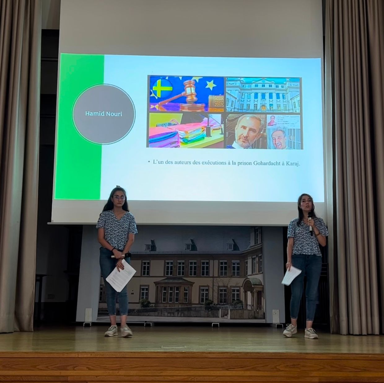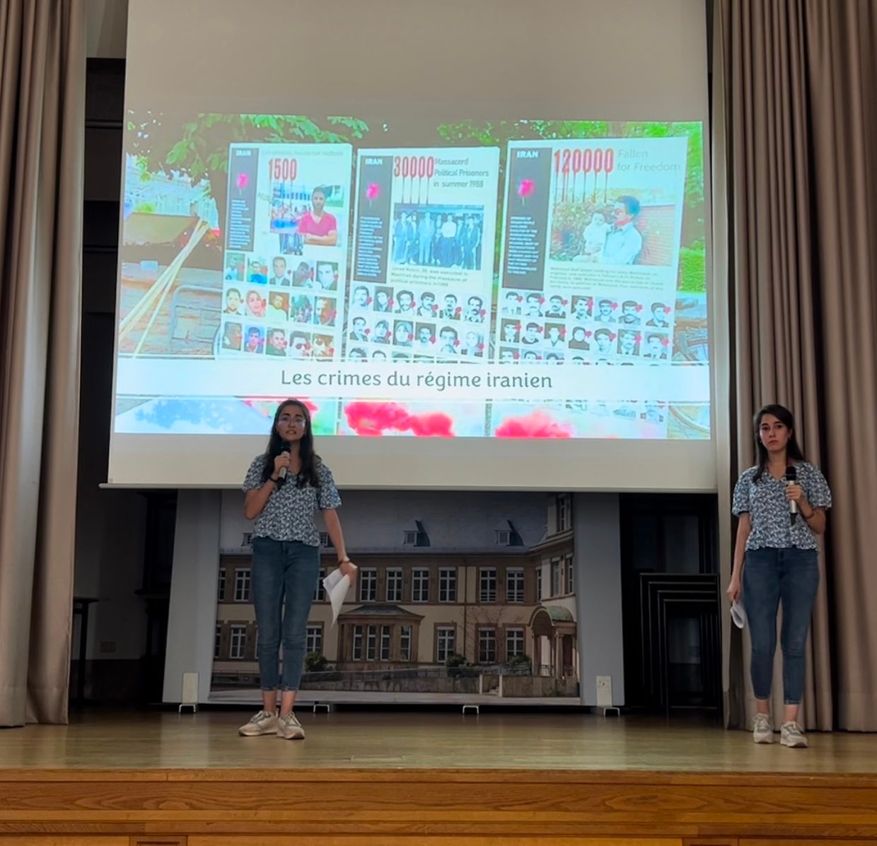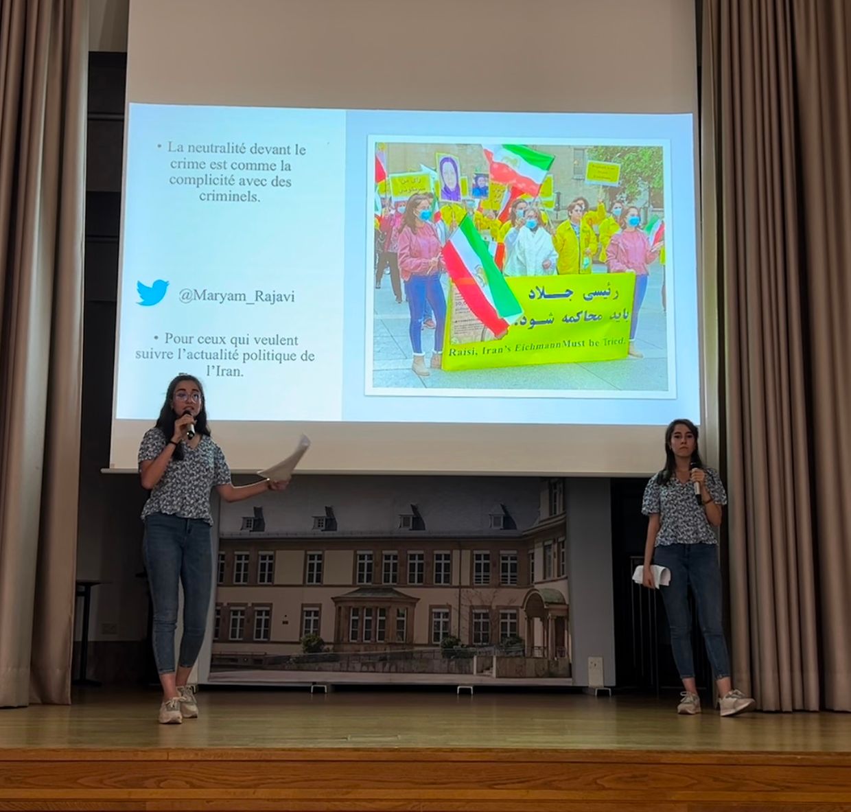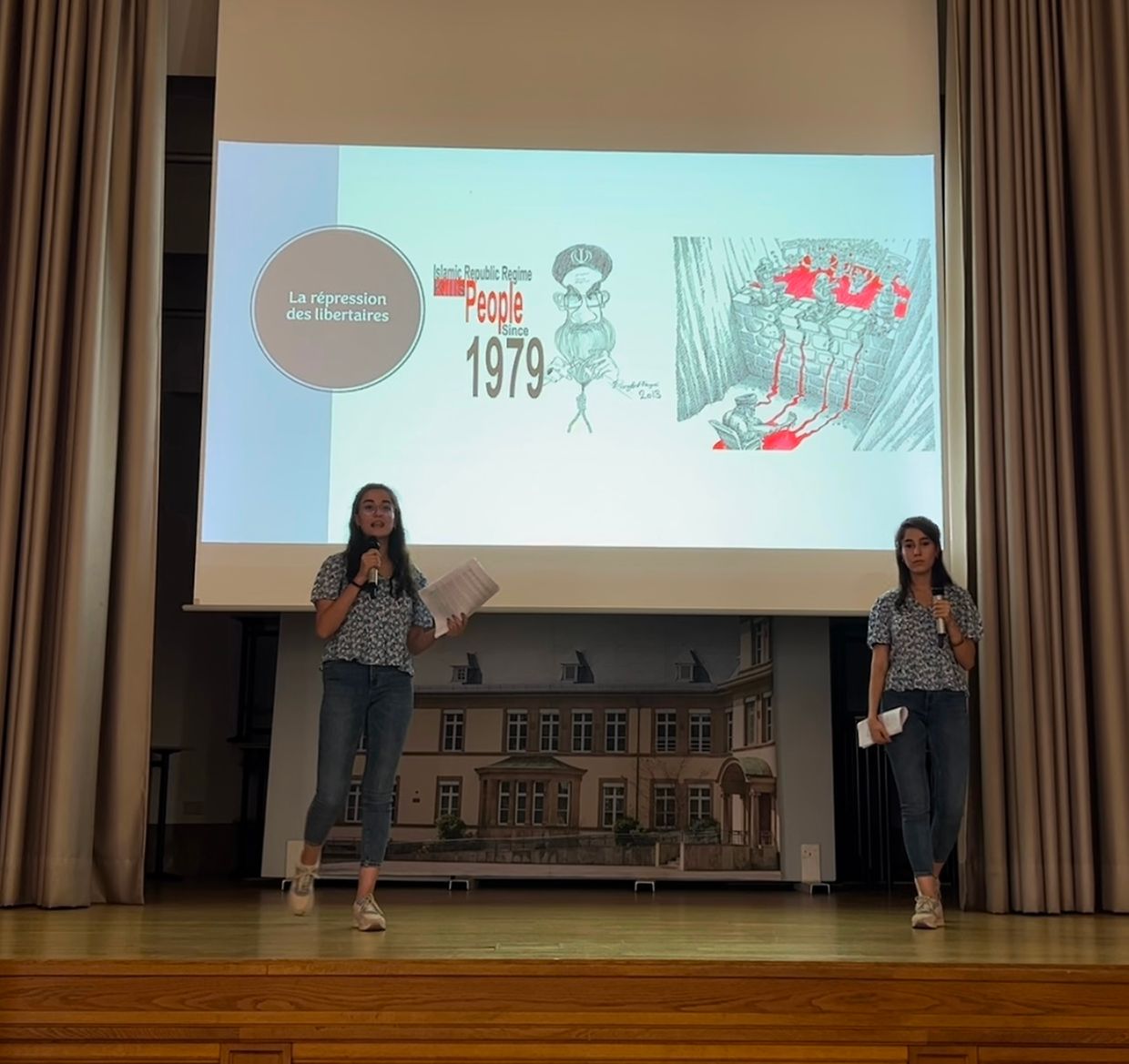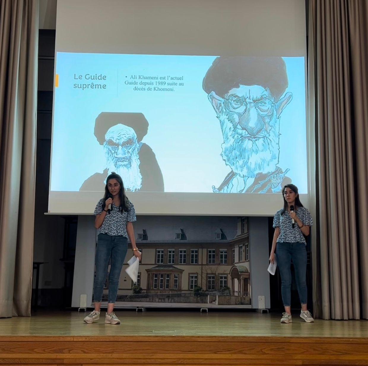 Nous, Ayla et Aylin MOUTAB POURREZAEI, élèves en classe CLIJAA1 au Lycée Robert-Schuman avons tenu un exposé le 29 juin 2022 en présence de la directrice, de plusieurs enseignants et d’autres invités. Cet exposé était divisé en deux parties. Dans la première partie, nous avons proposé une brève description géographique du pays et dans un deuxième temps nous avons évoqué l’histoire et le contexte politique de notre pays d’origine.