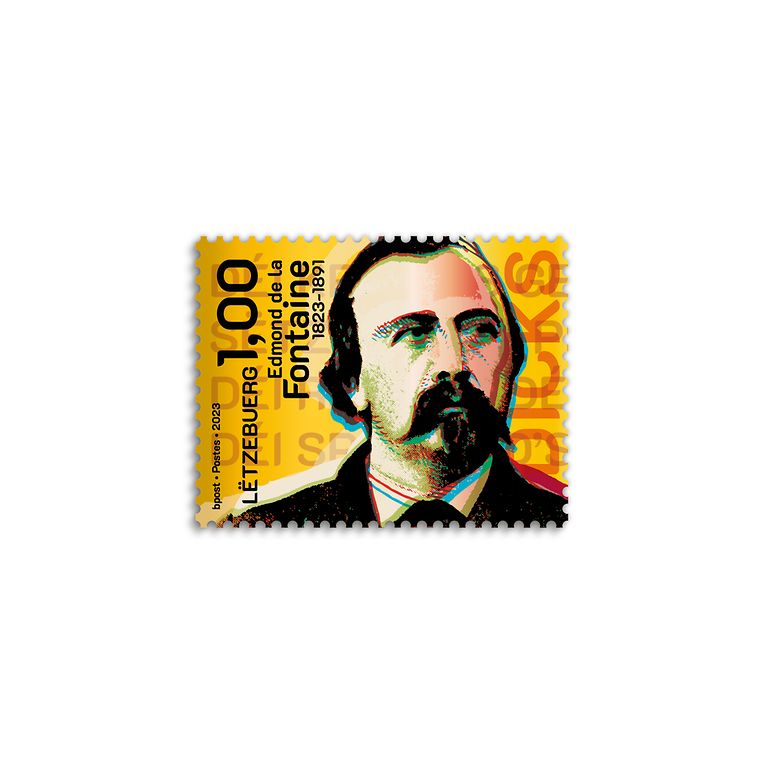 Edmond de la Fontaine, vor allem bekannt unter seinem Pseudonym „Dicks“, ist einer der wichtigsten Vertreter der luxemburgischen Literatur. Er gilt als Begründer des luxemburgisch-sprachigen Theaters. De la Fontaine wurde am 24. Juli 1823 in Luxemburg-Stadt geboren. Nach seinem Abitur studierte er zunächst von 1844 bis 1847 Jura in Lüttich und Heidelberg und arbeitete danach als Rechtsanwalt und Ergänzungsrichter. Später leitete er in Remich eine eigene Weberei, die allerdings Opfer der Wirtschaftskrise der 1860er Jahre und danach versteigert wurde. Bereits 1848 begann die literarische Karriere von Edmond de laq Fontaine. Vor 175 Jahren wurde sein Gedicht D’Vulleparlament am Grengewald im Volksfreund veröffentlicht. Die ersten Zeilen dieses Werkes, in dem er die Schwächen der progressiv-liberalen Abgeordneten des Luxemburger Parlaments auf satirisch-freche Art thematisiert, finden sich im Hintergrund auf der Briefmarke. Sein erstes Theaterstück De Scholtschein wurde 1855 uraufgeführt, gefolgt von zahlreichen Komödien wie De Koséng oder Schwârz oder Blont, D’Kirmesgèscht und De Ramplassang. Bei diesen einaktigen Singspielen schrieb Dicks sowohl die Texte als auch die Musik, die so populär waren, dass einige davon bis heute in Luxemburg wie Volkslieder gesungen werden. Sein bekanntestes Stück trägt den Namen D’Mumm Sës oder De G’escht. Er verfasste außerdem Gedichte in luxemburgischer, deutscher und französischer Sprache. De la Fontaine starb am 24. Juni 1891 in Vianden, seine sterblichen Überreste ruhen im Familiengrab in Stadtbredimus.