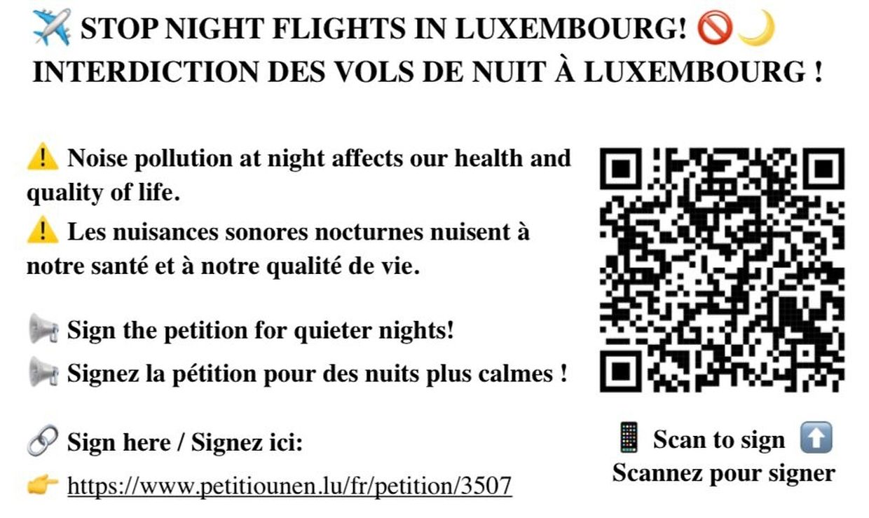 Bis dato wurden an 3 Samstagen Unterschriften für die Petition 3507 gesammelt. Die Petitionäre wehren sich gegen die stete Zunahme der Flüge ausserhalb der offiziellen Öffnungszeiten des Findels von 6h bis 23h. Lärmpegel von 80 bis 90 dB sind in der bereits sehr kurz bemessenen 'Sperrstunde’ die Regel, eine erholsame Nachtruhe gibt es an keinem einzigen Tag im Jahr. Betroffen sind v.a. der Südosten der Stadt, aber auch angrenzende Gemeinden im Nordosten des Findels. Die Unterschriftensammlung für vermehrt Respekt gegenüber der schlafenden Bevölkerung läuft noch bis zum 11. April.