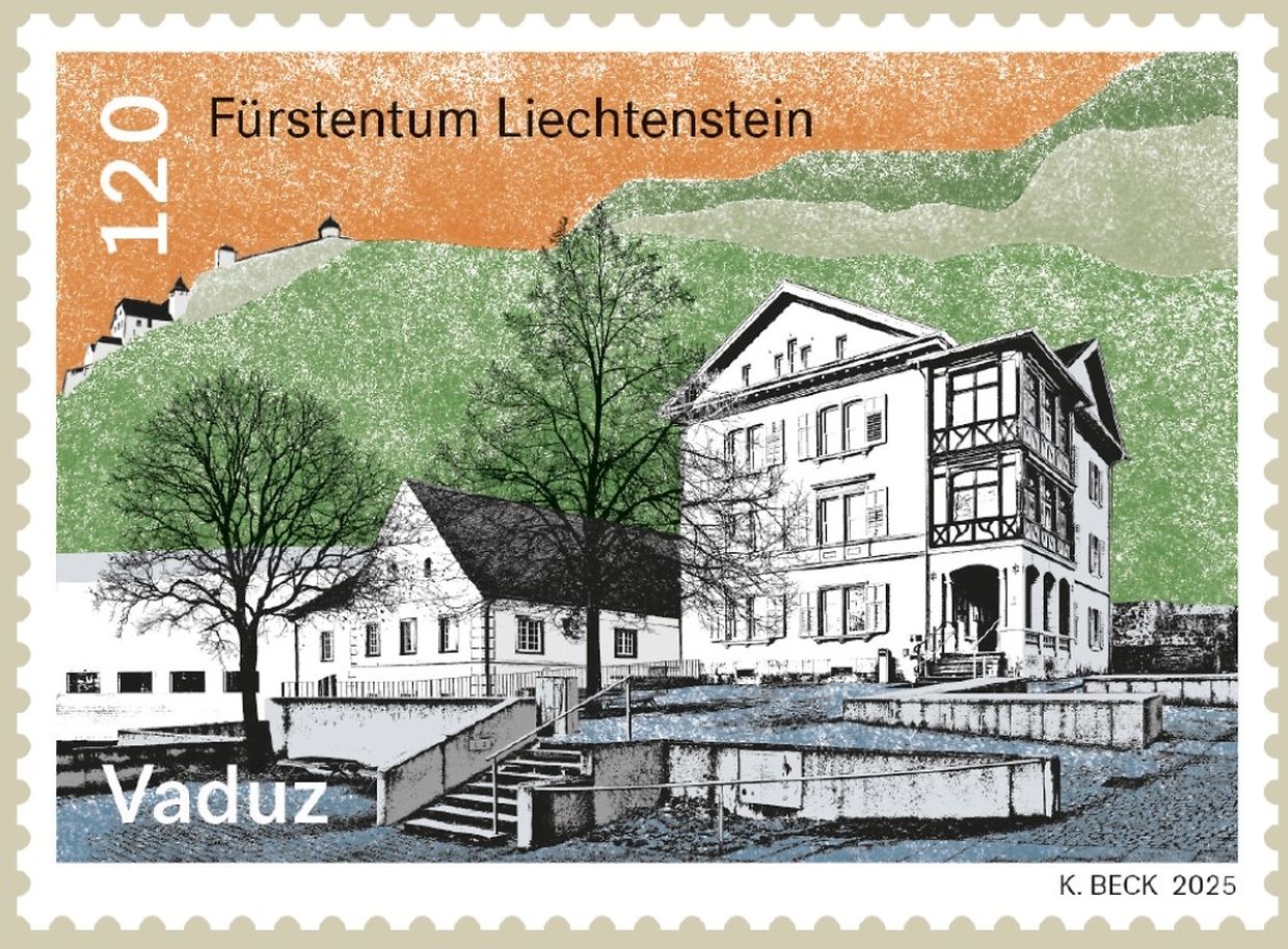 Zwei Marken mit Dorfansichten-Vaduz. Das Vaduzer „Mitteldorf“ (CHF 1.00), historisch „Metteldorf“, gehört zu den ältesten Siedlungsteilen von Vaduz. Es beherbergt heute eines der ältesten Bauernhäuser Liechtensteins, gebaut um das Jahr 1410. Die Gebäude im Mitteldorf gelten als sehr schönes Ensemble ländlicher Baukunst, welche sich bis Ende des 19. Jahrhunderts streng nach alten Handwerksregeln ausrichtete. Zum Mitteldorf gehören heute auch geschützte Weinberge (Rebzone) mit ihren Mauern und Bildstöcken, Kappile“ genannt. An der St. Florinsgasse steht das „Schädlerhaus“ (CHF 1.20), ein geschütztes Kulturgut Liechtensteins. Das klassische Gebäude wurde 1872/73 errichtet und besteht aus zwei rechtwinklig verbundenen, dreigeschossigen Baukörpern mit Giebeldächern. Im 19. Jahrhundert beherbergte es die Praxisräume des Arztes Rudolf Schädler (1845-1930), der hier als Arzt für die Vaduzer Bevölkerung die des Oberlands tätig war. Heute beherbergt das Schädlerhaus das Liechtensteiner Zivilstandsamt, womit das Schädlerhaus zum Zeugen jeder Ziviltrauung in Liechtenstein wird.