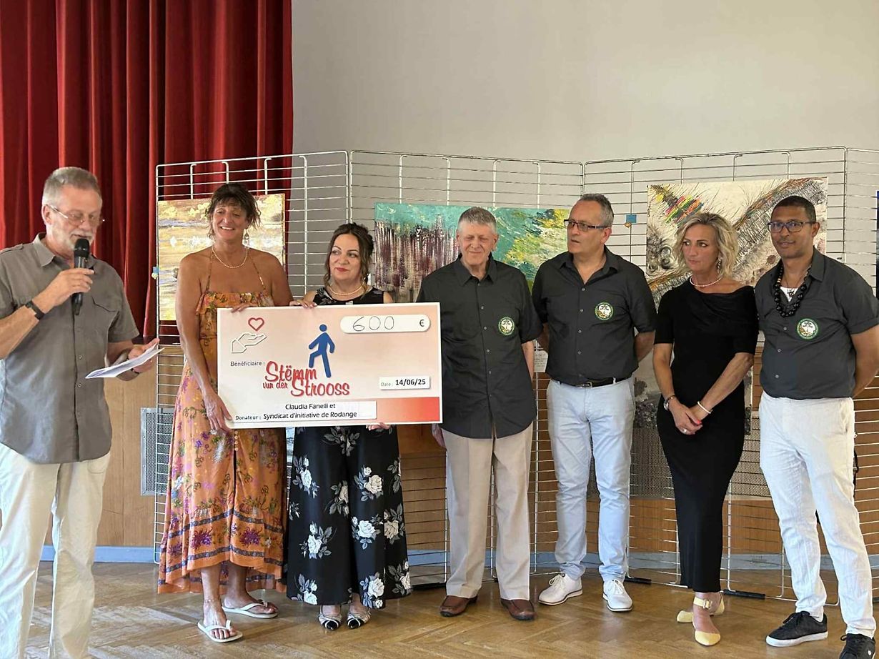 À l’occasion de sa dernière exposition, dont le vernissage s’est déroulé au centre culturel de Rodange en collaboration avec le syndicat d’initiative de Rodange, Claudia Fanelli a souhaité une fois de plus faire un geste concret et solidaire. 600 € ont ainsi été remis à Alexandra Oxacelay, directrice de l’association Stëmm vun der Stroooss, au profit de l’atelier de réinsertion professionnelle de Sanem Schweesdrëps, ce qui, dans la langue de Molière, signifie la goutte d’eau. 40 personnes y lavent chaque semaine les uniformes de 40 clubs sportifs, soit 4 000 uniformes, chaussettes et shorts.