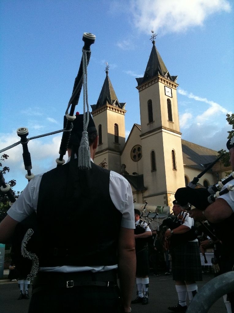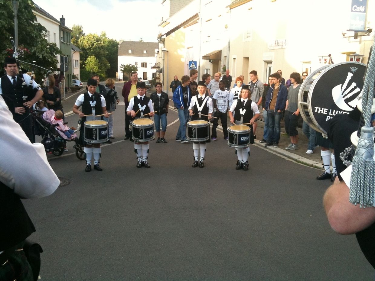 Quite unusual tunes filled the streets of Mamer on the evening of the 16th june. Sitting quietly at the terrasse of the "Café Kleng Gemeng" sipping their "Humpen" or a chilled rosé wine, the guest of the village pub where quite surprised when suddenly a pipe band turned up.