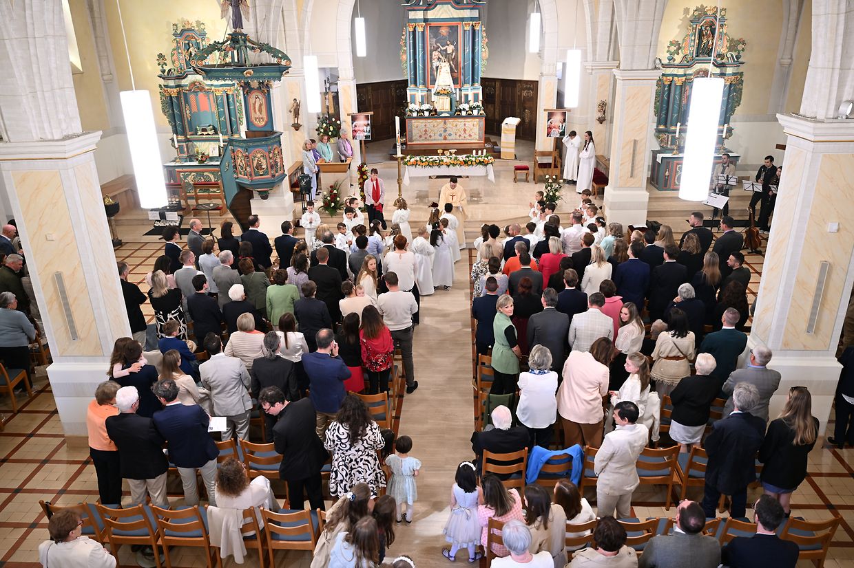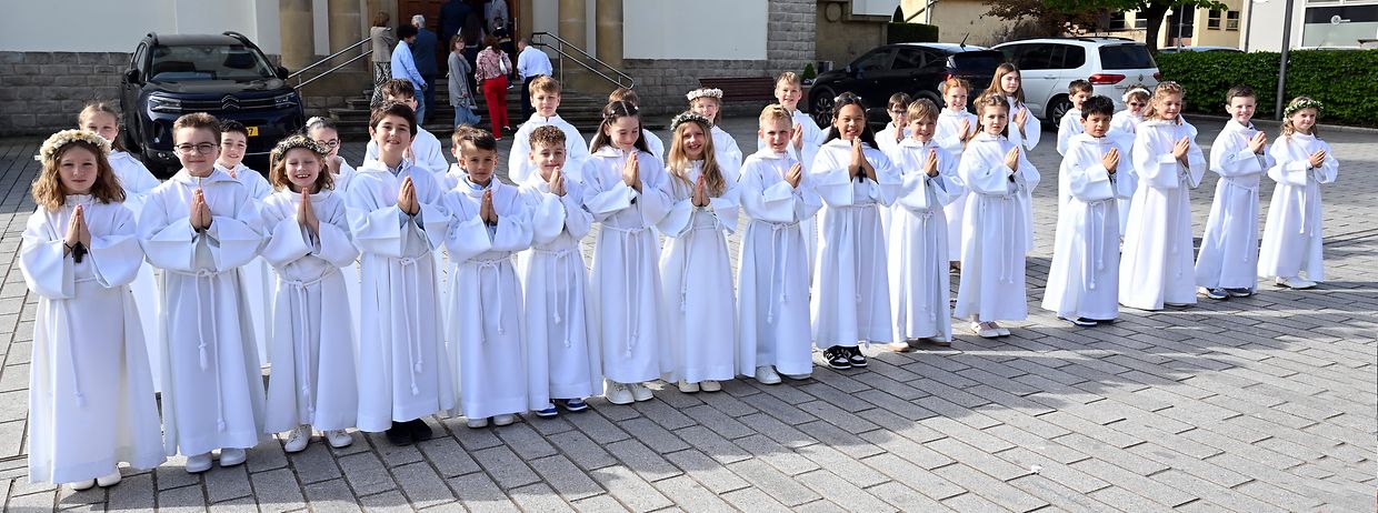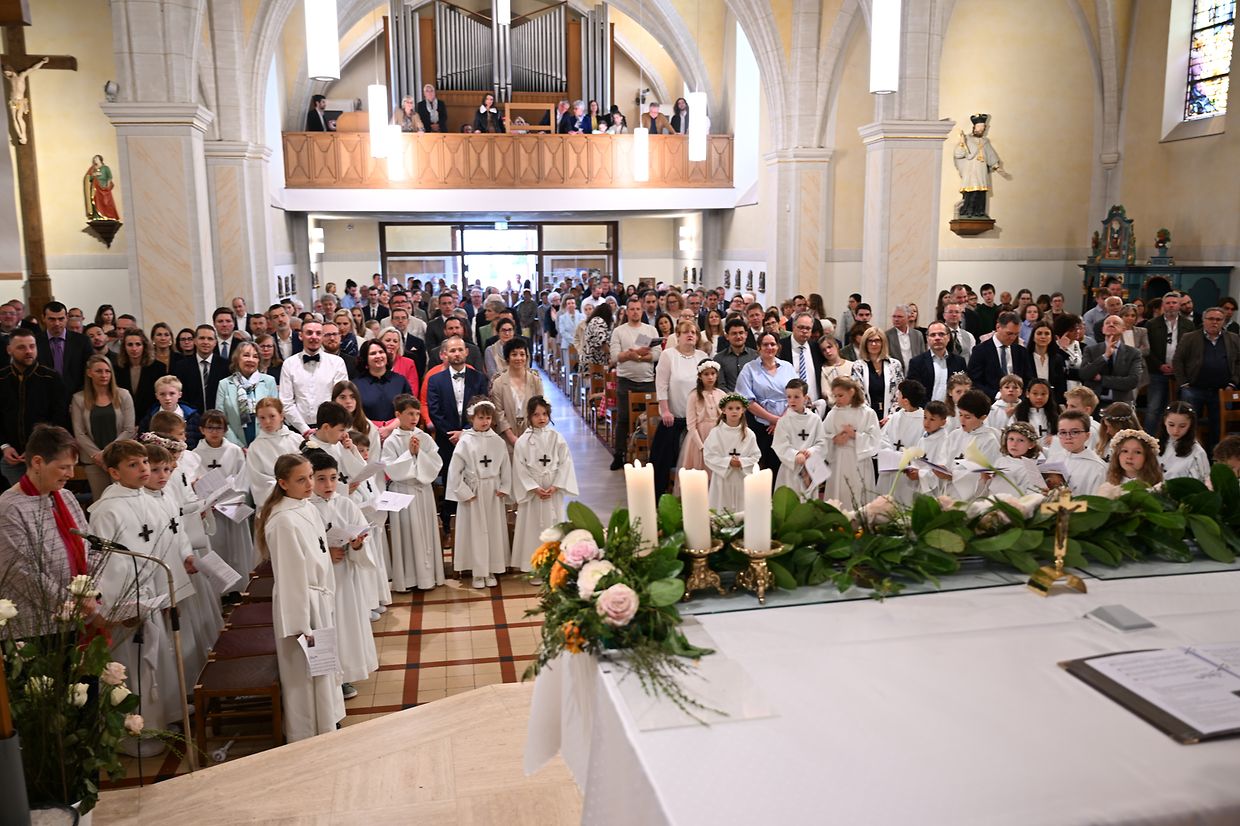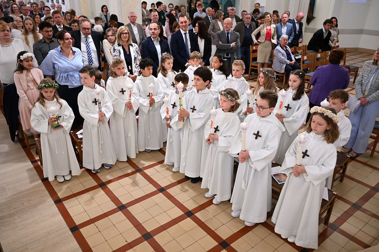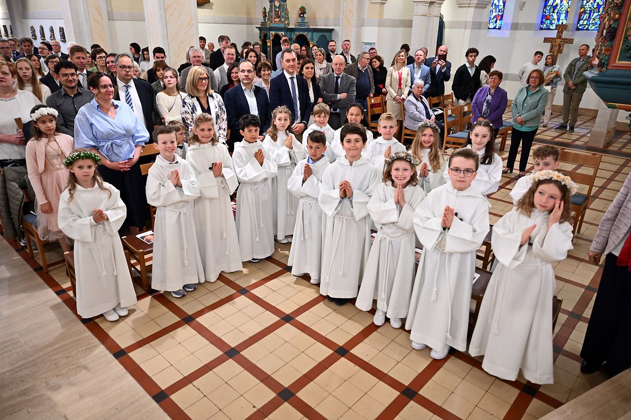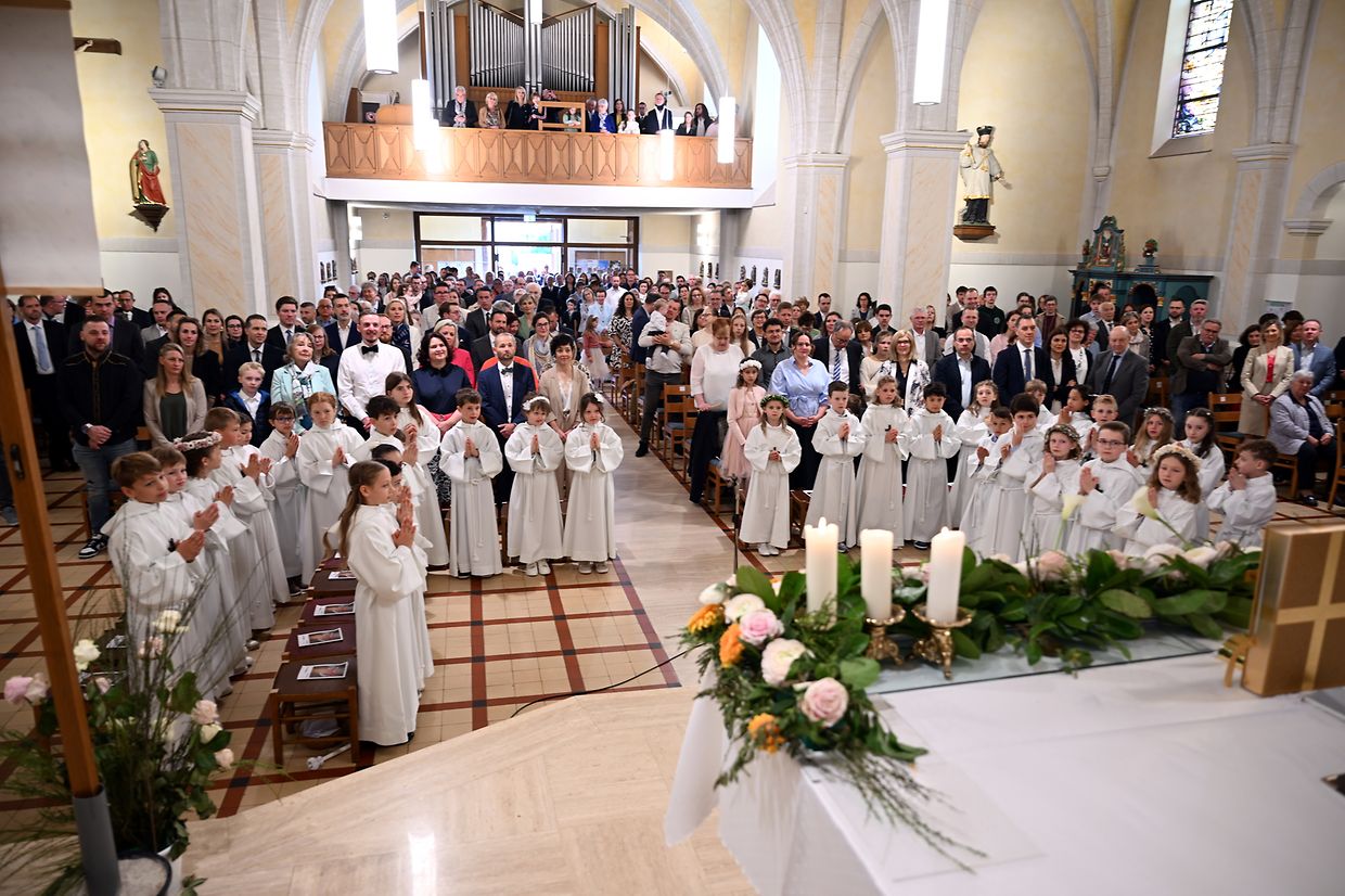 An der schéi gerëschter an dicht besaater Kierch vu Mamer, hun e Sonnden, den 27. Abrël 2025, 32 Kanner aus der Par Mamerdall Saint -Christoph hir éischt Kommioun vum Abbé Jacques Bruns, empfaangen. D'Kanner hun zesummen mat der Parassistentin Nicole Knoch an hirem Team an dem Instrumenten Ensemble, di schéi Mass musikalisch an och gesanglich matgestallt. Engt schéint Fest fir all Kanner an Elteren zu Mamer. (CR) (Fotoen: Charles Reiser)