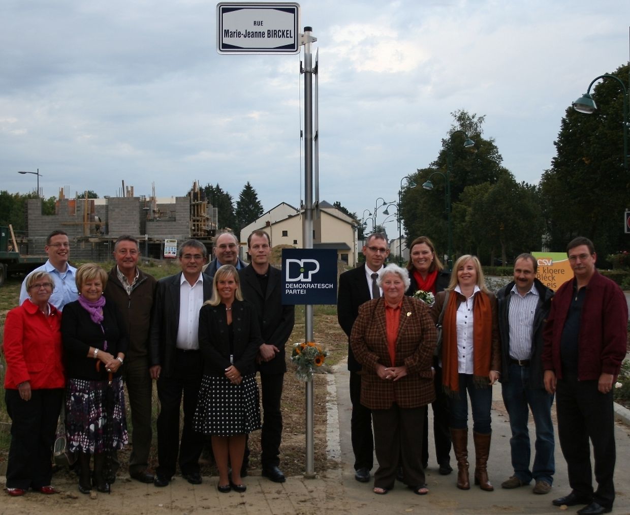 Vendredi soir une délégation du parti démocratique de la commune de Mamer ainsi que des membres de leur famille se sont réuni à l'entrée du lotissement Baumbusch à Mamer pour rendu hommage à Madame Marie-Jeanne Birckel. Après de maintes interventions des conseillers du parti démocratique au sein du conseil communal, l'administration à enfin nommé une rue au nom de Marie-Jeanne Birckel, la première femme qui fut élu et assermentée comme conseiller communal à Mamer. Jusqu'à ce jour elle reste aussi la seul et unique conseillère au sein de la section locale du DP Mamer.