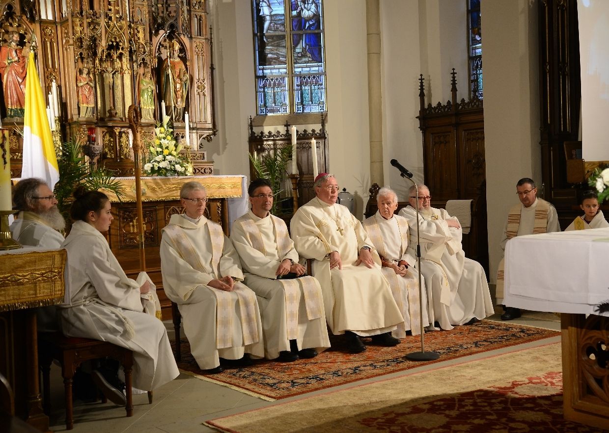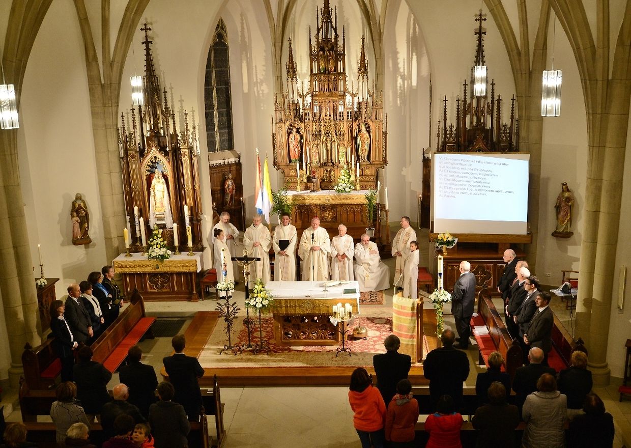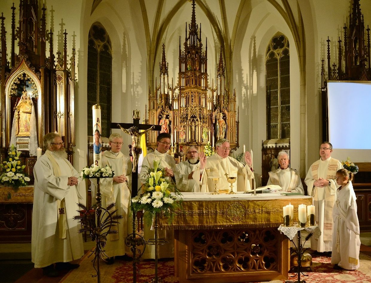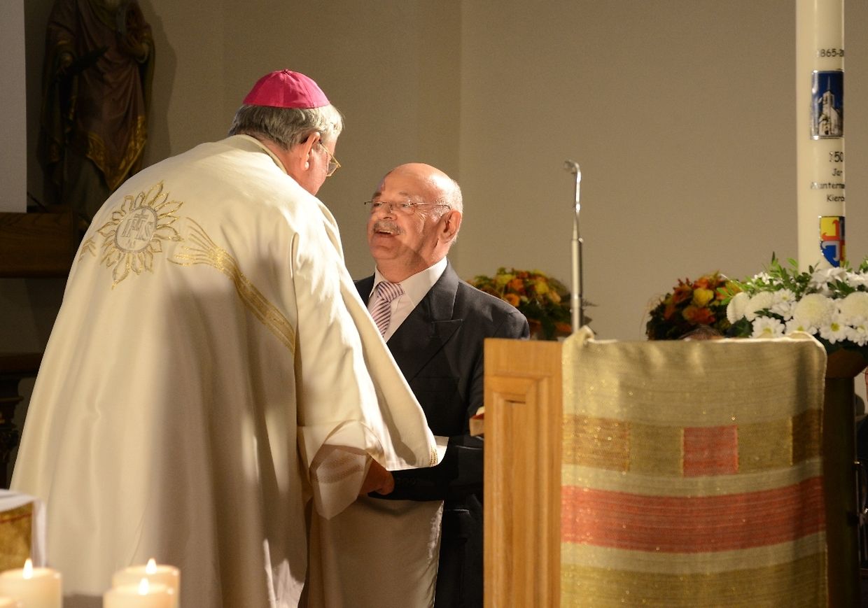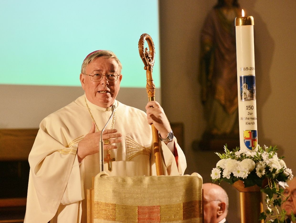 Eng konzelebréiert Mass, ënner der Leedung vum Här Äerzbëschof Jean-Claude Hollerich, war den Héichpunkt vun de Jubiläumsfeierlechkeeten, déi sech vum Juni 2015 bis de Juni 2016 hinzéien. Virun der Mass ass op der Plaz virun der Kierch eng Erënnerungsplack ageweiht ginn, op där d'Nimm vun de Manternacher Paschtéier an d'Geschicht vun der Par ze liese sinn. An der Kierch huet de President vum Organisatiounscomité, Roby Mehlen dozou Explikatioune ginn. Duerno huet de President vum Kiercherot, Aloyse Schumacher, den Här Äerzbëschof an d'Éiregäscht begréisst an Iwwerleeungen iwwer d'Kierch an éiser Zäit ugestallt. An sénger Priedegt ass den Äerzbëschof op dës Thematik agaangen an huet séng Vue vun der Zukunft vun der Kierch ausernee geluegt. Um Enn vun der Mass huet de Buergermeeschter Henri Frank séng Satisfactioun iwwer déi réusséiert Restauratioun vun der neigothescher Manternacher Kierch gesot an der Kierch d'Ënnerstëtzung vum Manternacher Gemengerot zougeséchert. D'Chorale vu Mompich, déi d'Mass gesongen haat, huet Merci gesot kritt, an duerno ass hannen an der Kierch e gudd Glieschen Pinot gris 2011 aus der Manternacher Fiels zervéiert ginn.