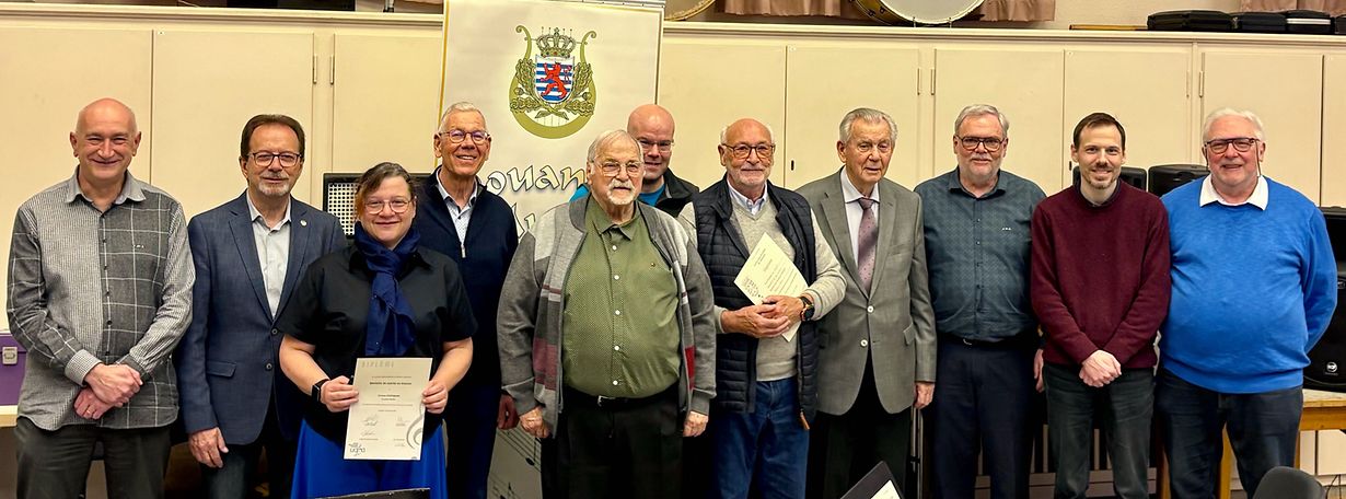 De President Änder Friden konnt als Éieregäscht den UGDA-Éierepresident Robert Weyland, de Sekretär vun der USMVL André Hever an den Éierepresident vun der Douane´s Musek Jean-Pierre Reuter op der 34. Generalversammlung begréissen. De Sekretär Fernand Bartemes huet Rapport gemaach iwwer e Joer 2025 mat ganz villen Optrëtter an de verschiddenste Besetzungen. Besonnesch ervirzesträiche waren de Concert zu Viroinval (B) mat der Harmonie Royale des Finances (HRF) an der Zollkapelle Aachen, d´Parad fir Nationalfeierdag mat der HRF an der Garnisounsmusek, de gemeinsame Concert mat der HRF um BENELUX-Dag an awer och nach de leschte Besuch vum Grand-Duc Henri beim CGDIS. E wonnerbare Concert huet Douane´s Musek ënnert der Leedung vun hirem Sous-Chef Claude Hoffmann zu Rëmeleng gespillt, wou hiren eelste Musikant Valentin Weinert säi leschte Solo gespillt huet. De Claude Hoffmann huet interim den Dirigenteposten iwwerholl bis Douane´s Musek en neien Dirigent huet. Den Tresorier Henri Nimax, deen dës Funktioun zënter 30 Joer ausféiert an duerfir mat der Plaquette de reconnaissance Jean-Antoine Zinnen ausgezeechent gouf, konnt e positive Bilan vun der Keess presentéieren, wat et der Douane´s Musek erméiglecht am Summer eng kleng Rees op Hamburg ze maachen. Den USMVL-Vertrieder konnt de Musikante Claude Hoffmann a Max Kuborn d´Medaill en argent vun der USMVL iwwerreechen. De Fernand Bartemes an de Jean-Marie Waldbillig krute vun der UGDA d´Croix de mérite en argent, de Pitt Fischer an d´Viviane Hoffmann kruten d´Sëlwer respektiv Bronze Medaill vun der UGDA an de Michael Koch d´Verbandsofzeechen. Eng besonnesch Éierung fir 80 Joer am Déngscht vun der Kultur an dem Benevolat krut de Valentin Weinert am Numm vun der UGDA duerch de Robert Weyland iwwerreecht. Nodeems de President déi nei Musekskap presentéiert huet, déi bei der Parad fir Nationalfeierdag fir déi éischte Kéier an den Asaz kënnt, huet hien op e gemeinschaftlecht Iessen invitéiert.