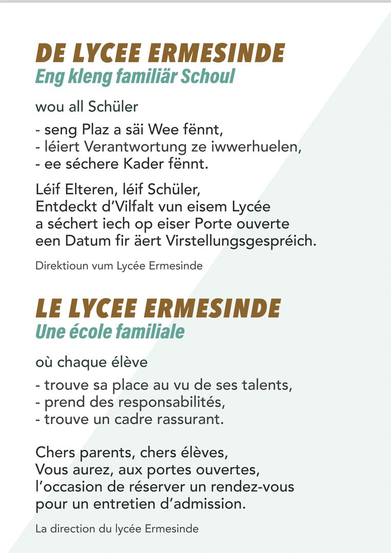 Veuillez trouver ci-dessous des informations concernant la journée « Portes ouvertes » du Lycée Ermesinde :