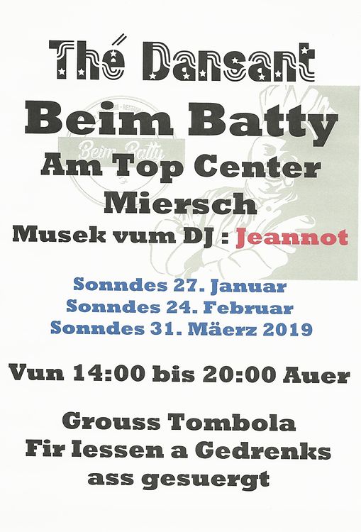 Sonndes, den 27. Januar organiséiert de Mierscher Fëscherclub, vun 14:00 bis 20:00 Auer, säin éischten Thé Dansant fir dëst Joer beim Batty zu Miersch am Top-Center, mam DJ Jeannot.