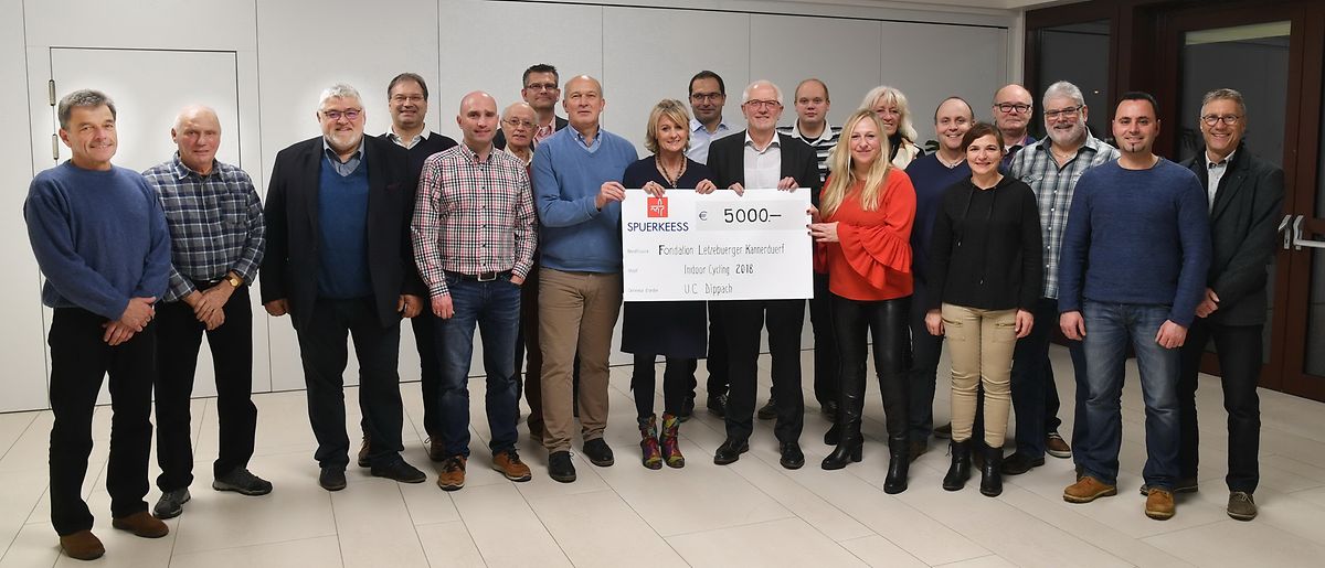 Eine Idee um Geld zu sammeln und in die Tat umzusetzen, dieses machte nämlich die „ Union Cycliste Dippach“. Sie organisierten im November einen“ Charity Indoor Cycling“ auf dem Krounebierg in Mersch, der erneut einen großen Erfolg kannte, und dessen Ziel es war, mit dem Erlös dieser Veranstaltung mit sportlichem Charakter für den guten Zweck zu übergeben. Im Rahmen der Schecküberreichung in den Räumlichkeiten des Merscher Kinderdorfes, ging Vereinspräsident Henri Jungels auf die Geschichte und auf die positive Entwicklung des seit 1935 bestehenden und landesweit führenden Fahrradsportvereines mit seinen rund 65 lizensierten Rennsportler ein. Nach seinem Dank an alle 450 aktiven Teilnehmer, die während vier Stunden radelten, der lokalen Sportskommission, der Gemeindeverwaltung Mersch mit allen Sponsoren, zeigte sich der Vorsitzende mit seinem Vorstand auch ganz erfreut, die Einnahmen dieser Sportveranstaltung in Mersch in Form eines Schecks in Höhe von 5 000 Euro an Jean- Paul Karpen, Generaldirektor und Cynthia Conzemius, administrative Direktorin im „ Kannerduerf Lëtzebuerg“ zu überreichen. Diese bedankten sich recht herzlich für die noble Geste und Unterstützung, stellten die Organisation des Merscher Kinderdorfes vor, wo derzeit rund 150 Mitarbeiter sich um 400 Kinder kümmern, die dort ein Teil ihres Lebens verbringen müssen, wo dieses Geld in Zukunfts- Projekte zugunsten der Kinder auch wirkungsvoll eingesetzt werden. (TEXT/FOTO: CHARLES REISER)