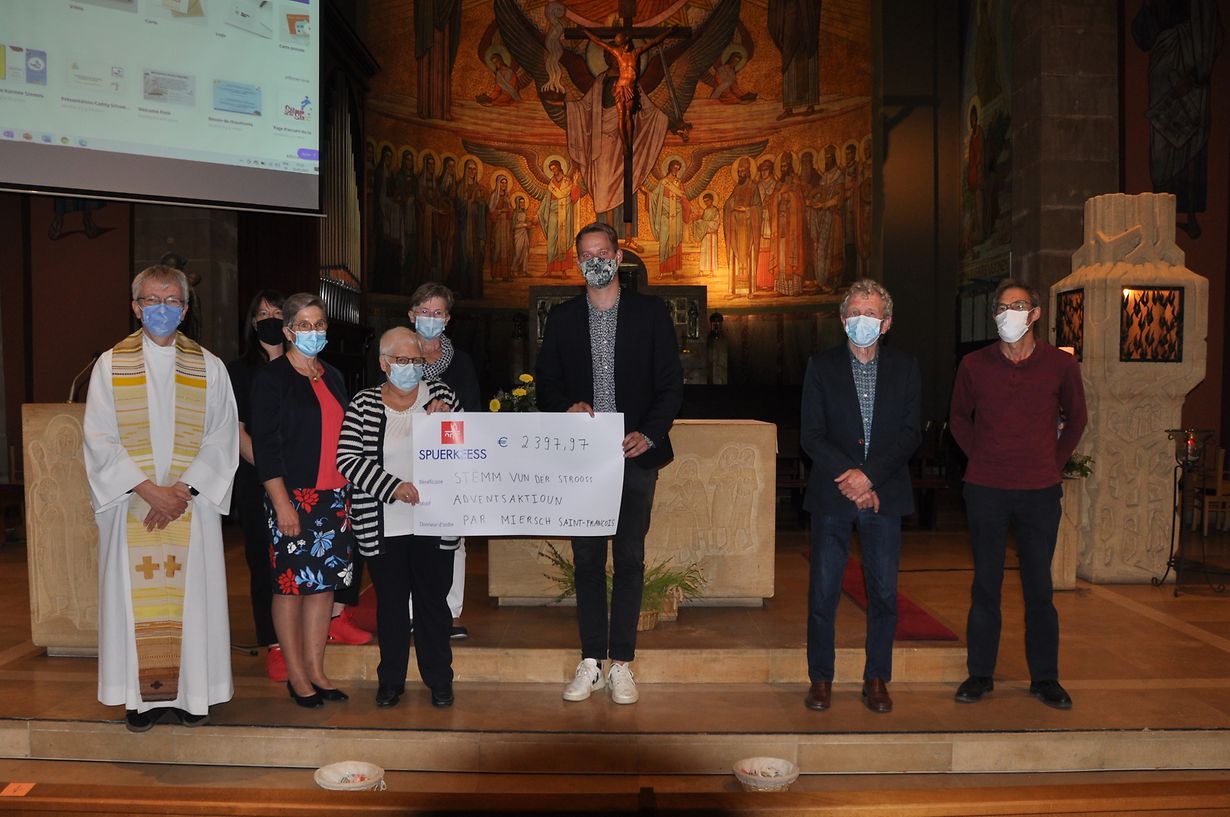 In der Pfarrei Mersch ist es schon seit Langem eine Tradition den Erlös der Adventsaktion einem wohltätigen Zweck zu spenden. Kürzlich konnte im Anschluss an den Sonntagsgottesdienst ein Scheck an die Vereinigung „Stëmm vun der Strooss“ übereicht werden. Bob RITZ von der „Stëmm“ erklärte in einem kurzen Vortag die Ziele, Aufgaben und Strukturen der Vereinigung. So werden zurzeit die gesammelten Gelder in die Finanzierung des neuen Gebäudes in Sassenheim fließen, wo Werkstätten entstehen für Menschen die sich in einem beruflichen Reintegrationssystem befinden.