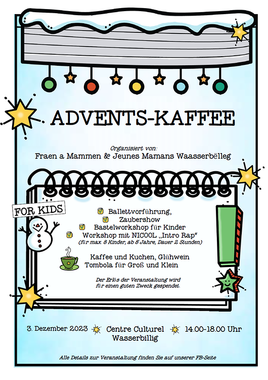 Kommt bei eis laangst a verbréngt e puer gemittlich Stonnen matt eis zesummen bei Kaffee a Kuch, Kippchen, Glühwäin a Bréidercher mat Würschterscher.