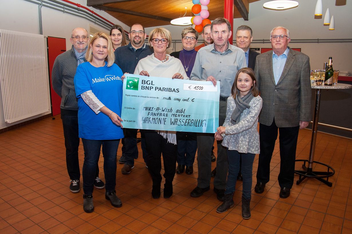Viru kuerzem hunn d'Comitéssmemberen vun der Fanfare Concordia Mäertert an der Harmonie Waasserbëllig e Scheck vun 1500€ un d'Madame Joëlle FALTZ, Vertriederin vun der Ong "Make-a-Wish" iwwerreecht.
