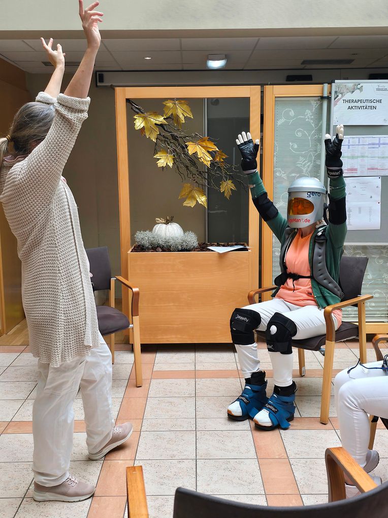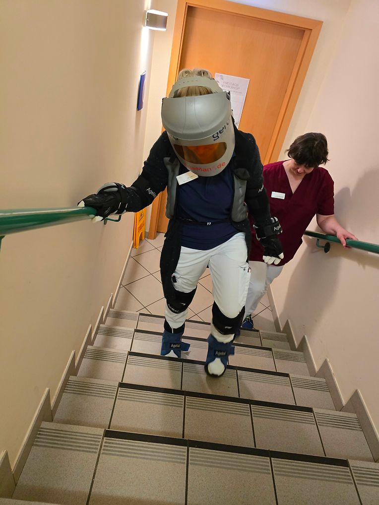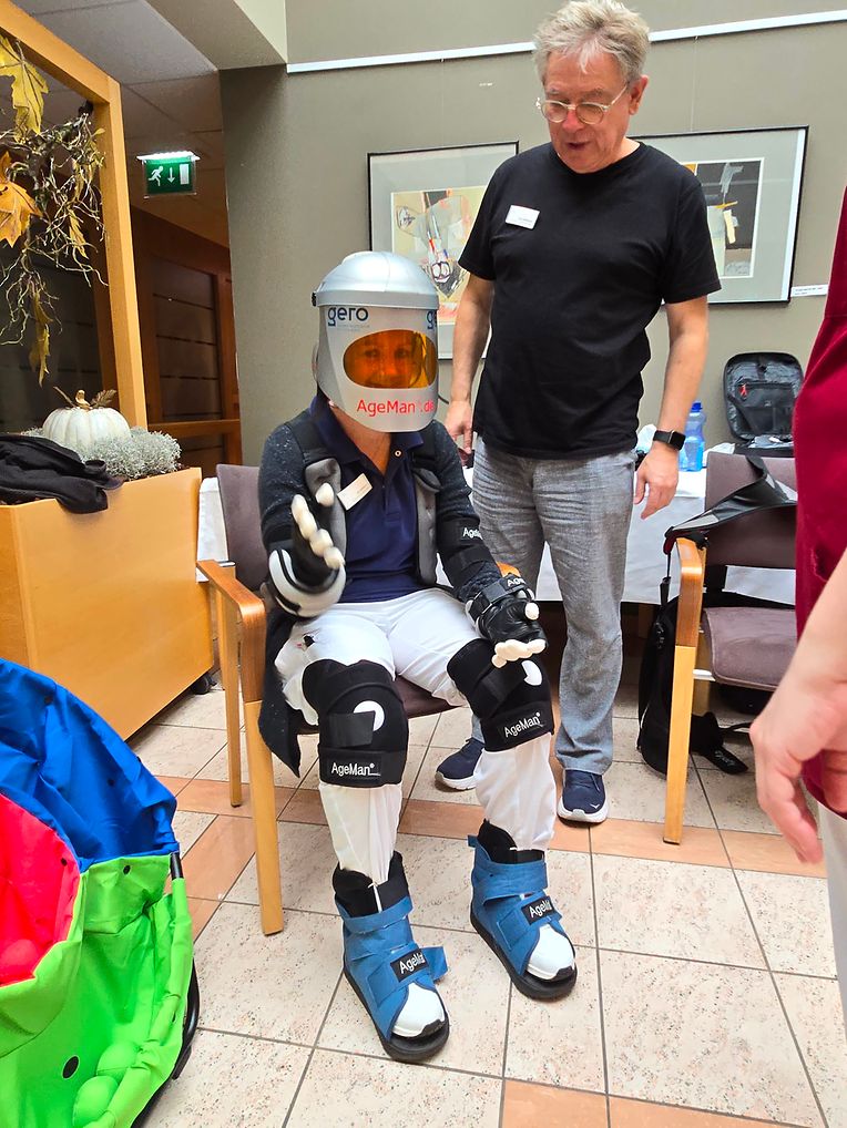 Mit dem „Ageman®“ erhielten junge Mitarbeitende und Besucher die Möglichkeit, auf beeindruckende Weise am eigenen Leib zu erfahren, wie er sich anfühlt, wen man älter wird. In diesem Alterssimulationsanzug konnte ein Parcours durch das Pflegeheim absolviert werden.
