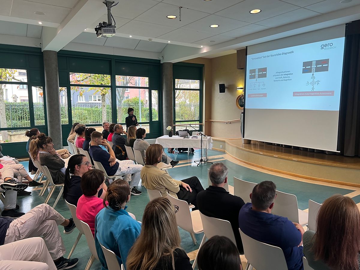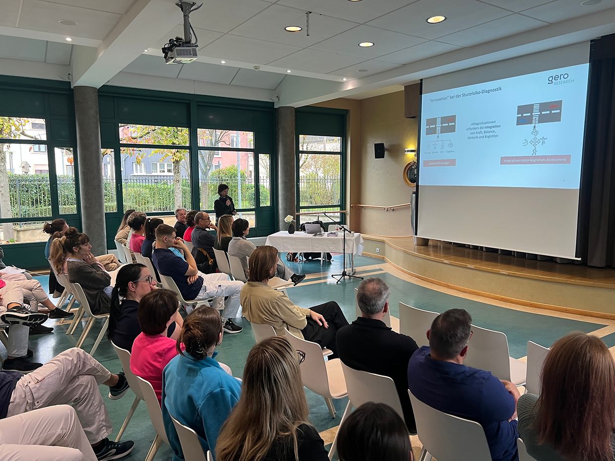 Unterschiedliche thematische Vorträge standen auf dem Programm. Einerseits stellte Dr. Martine Hoffmann das Projekt FLUX vor, das in in Zusammenarbeit mit GERO – Kompetenzzenter fir den Alter, der Universität Luxemburg und der Universität LUNEX durchgeführt wurde. mit dem Titel „Innovative Sturzvorhersage in Luxemburg durch motor-kognitive Tests“.