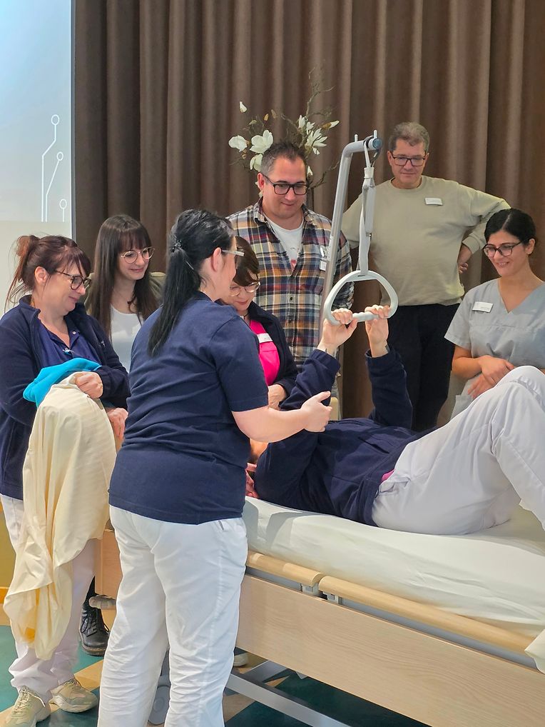 Die Kinésithérapeuten Dominik Zwick und Michèle Dustert stellten wirksame Maßnahmen zur Sturzprävention in stationären Einrichtungen der Altenhilfe vor. Krankenpfleger Michael Theis beeindruckte die Zuhörer mit den Möglichkeiten, die die Kinaesthetik bietet, rückenschonend zu arbeiten und damit beispielsweise die Lagerung pflegebedürftiger Menschen zu erleichtern.