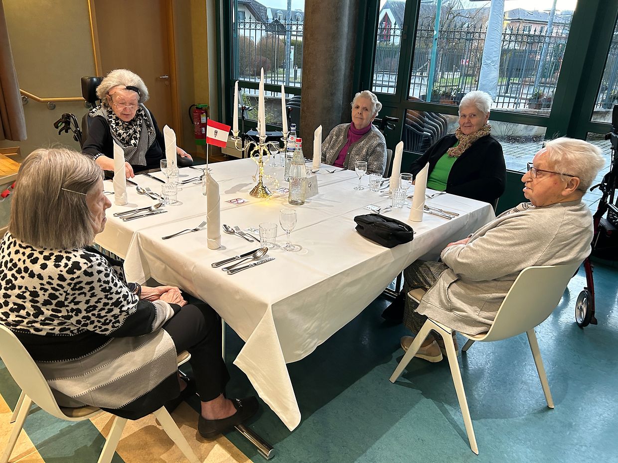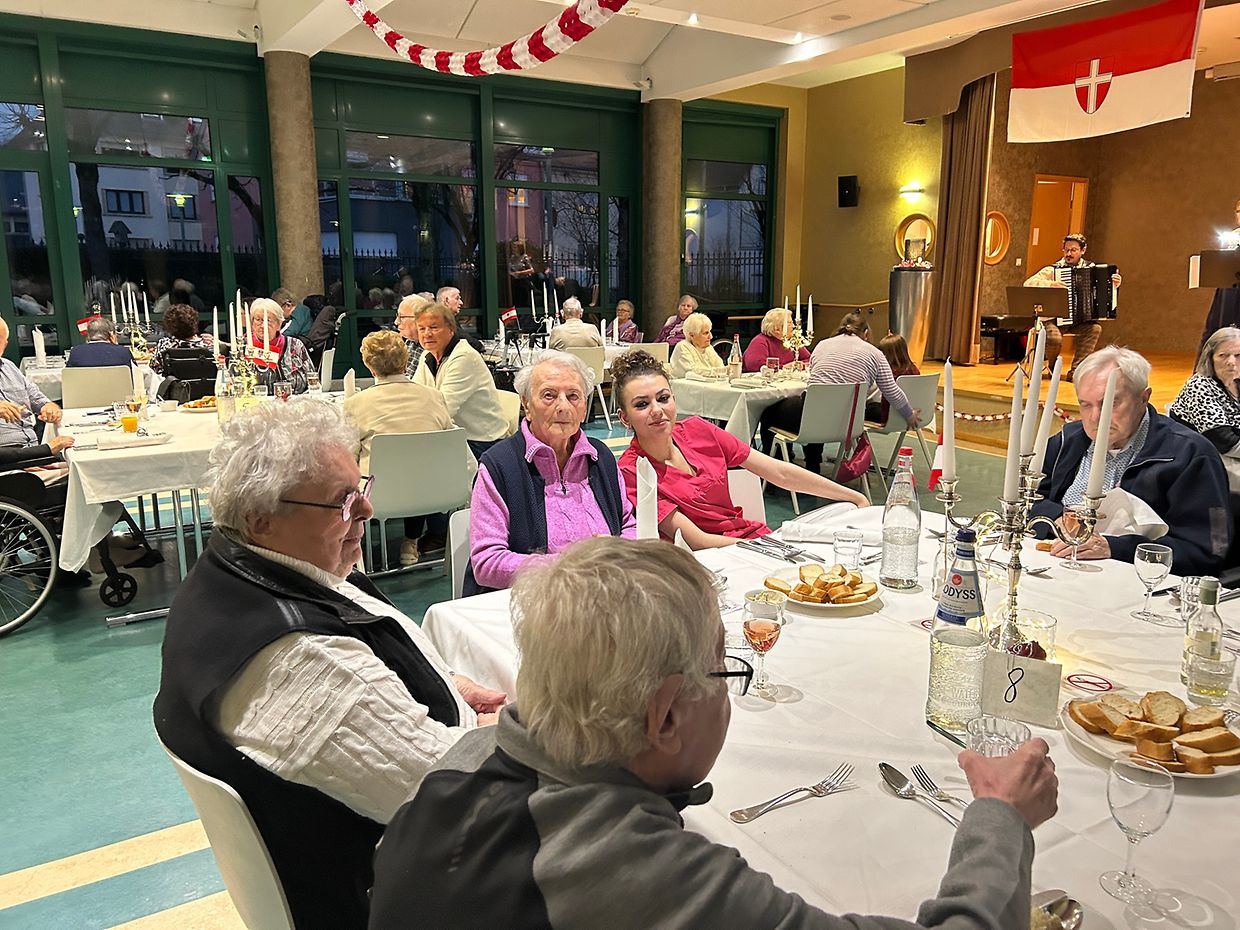 Vor einigen Tagen erlebten die Bewohnerinnen und Bewohner der Résidence Op Lamp in Wasserbillig zusammen mit ihren Gästen einen stimmungsvollen und kulinarischen „Wiener Abend“, der keine Wünsche offenließ. In dem zu diesem Anlass passend dekorierten Festsaal wurden die Gäste mit einer typisch wienerischen Menüfolge verwöhnt, die sie in die kulinarische Welt der österreichischen Hauptstadt entführte. Den Auftakt bildete ein köstlicher Sacherkäse, der in Kombination mit knusprigem Baguette hervorragend mundete. Es folgte eine reichhaltige Griessnockersuppe, die für ihren feinen Geschmack geschätzt wurde. Als Hauptgericht kam das Highlight des Abends auf den Tisch: das klassische Wiener Schnitzel, goldbraun paniert und serviert mit Pommes Frites und Salat als Beilage. Den krönenden Abschluss des kulinarischen Teils des Abends bildete ein delikater Kaiserschmarrn, der in großzügigen Portionen serviert wurde. Der fluffige Teig, kombiniert mit Granatapfel, sorgte für einen süßen Abschluss des Menüs.