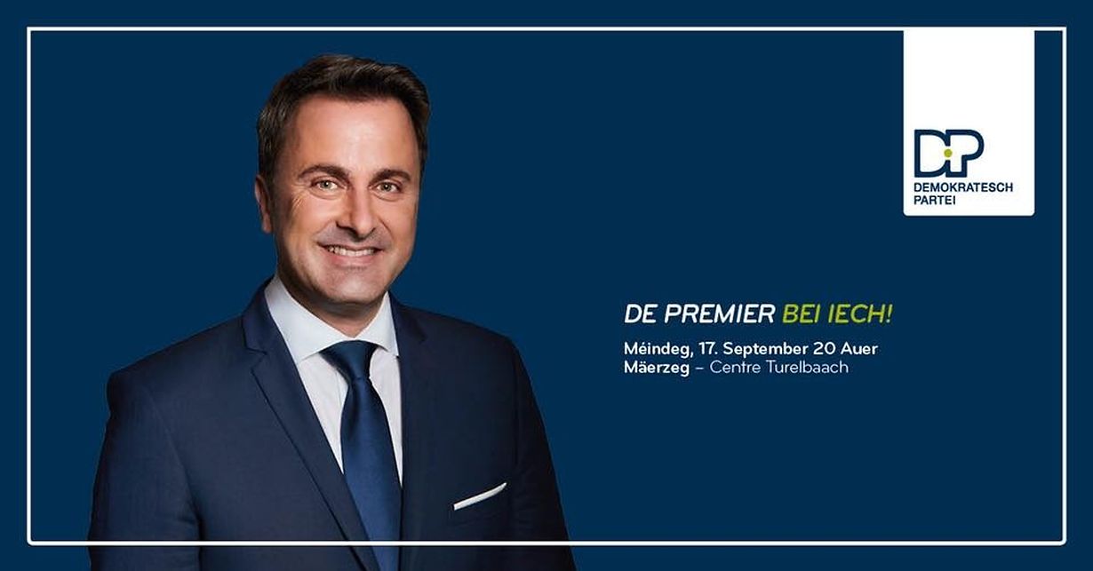 Mertzig DE PREMIER BEI IECH! - Mäerzeg 17 Sep 2018 17 Sep See More 17 Sep Jeff Feller Published on Tuesday, 11 September, 2018 at 07:45 Mertzig, Luxemburg Kommt an diskutéiert mam Premierminister an DP-Spëtzekandidat Xavier Bettel Méindeg, 17. September um 20 AuerMäerzeg – Centre Turelbaach(22, rue Principale, 9168 Mertzig) (LU&FR) Traduction silmultanée en français Report inappropriate content