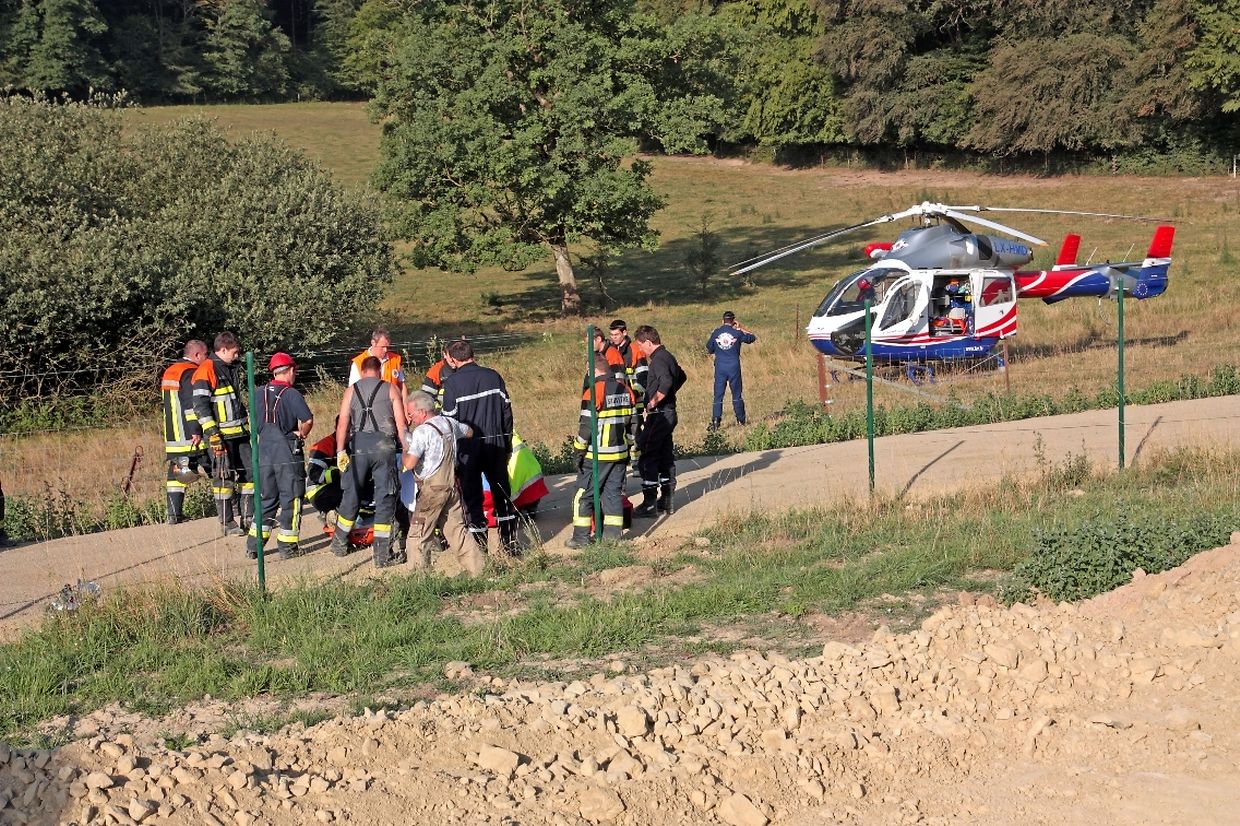Aus bisher noch unbekannter Ursache war ein Arbeiter in eine Grube 3 Meter tief gefallen. Dabei hatte sich der Unglückliche Verletzungen am Rücken zugezogen und konnte sich nicht mehr selbst retten. Der Verletzte musste schonend durch die Rettungskräfte aus seiner misslichen Lage befreit werden. Der Verletzte wurde noch vor Ort durch den Notarzt erstversorgt und anschliessend ins Hôpital Kirchberg geflogen. Über die Schwere der Verletzungen liegen bisweilen keine Details vor.
